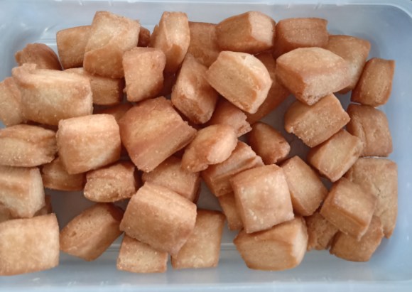 3) Make 2 equal parts of dough and roll to thick roti and cut into 1 inch square.