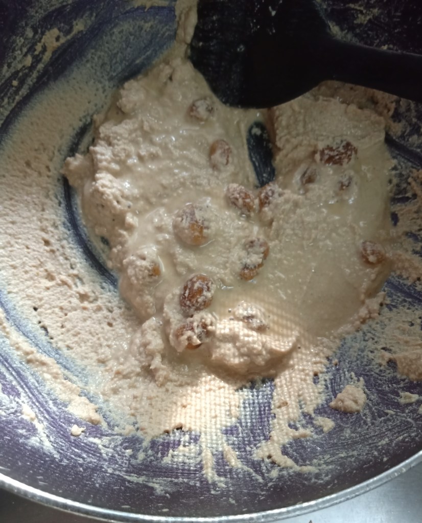 3. Now you can see ghee seperates from flour, at this moment add raisins and stir continuously. Immediately you can see all raisins swells .All this process under slow flame only.