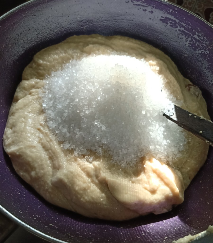 6. Add sugar and mix thoroughly while continous stirring.