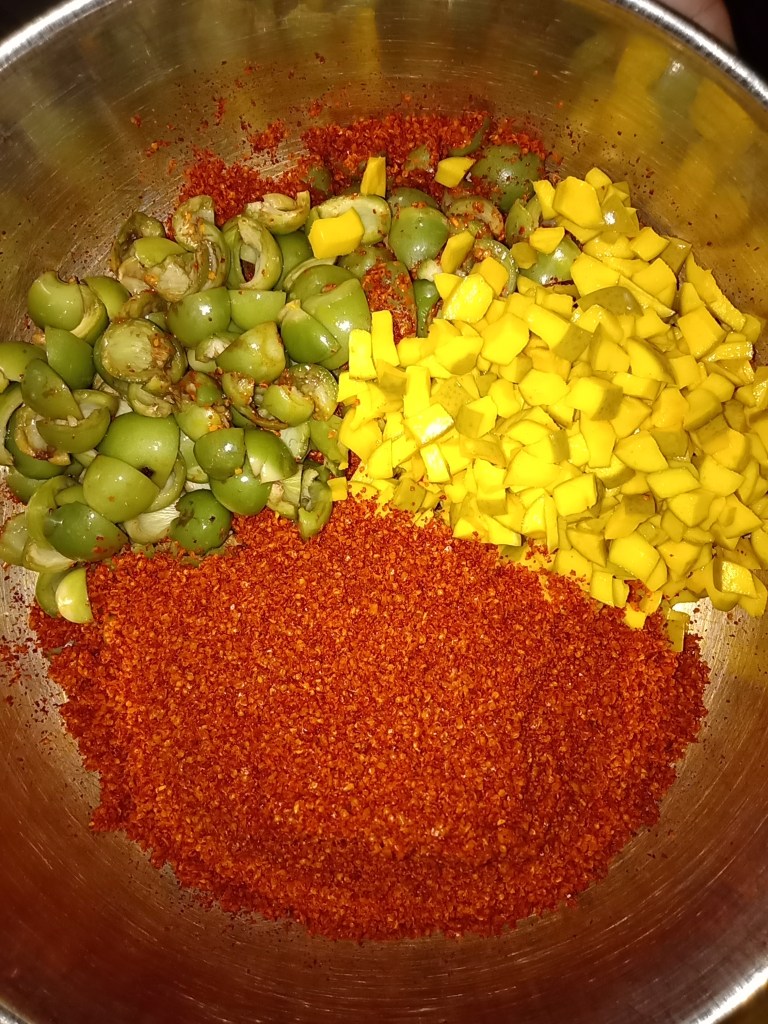 - After 24 hrs. remove keri pieces in strainer. You can use this strained salt turmeric water in pickle like khati gurmar,dara, kerda,lila mari and gunda.