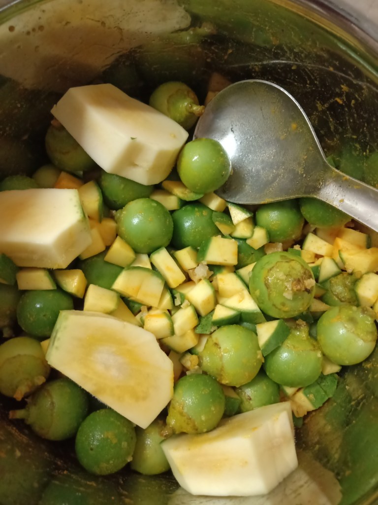 6. In sauce pan mix keri ,gunda and guwar with salt and turmeric powder.