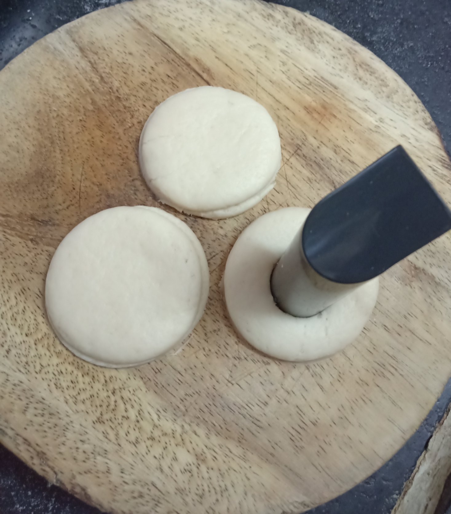 6. Each small circles cut with the help of ½ inch size bottle cap. So you get each doughnuts with hole in center.