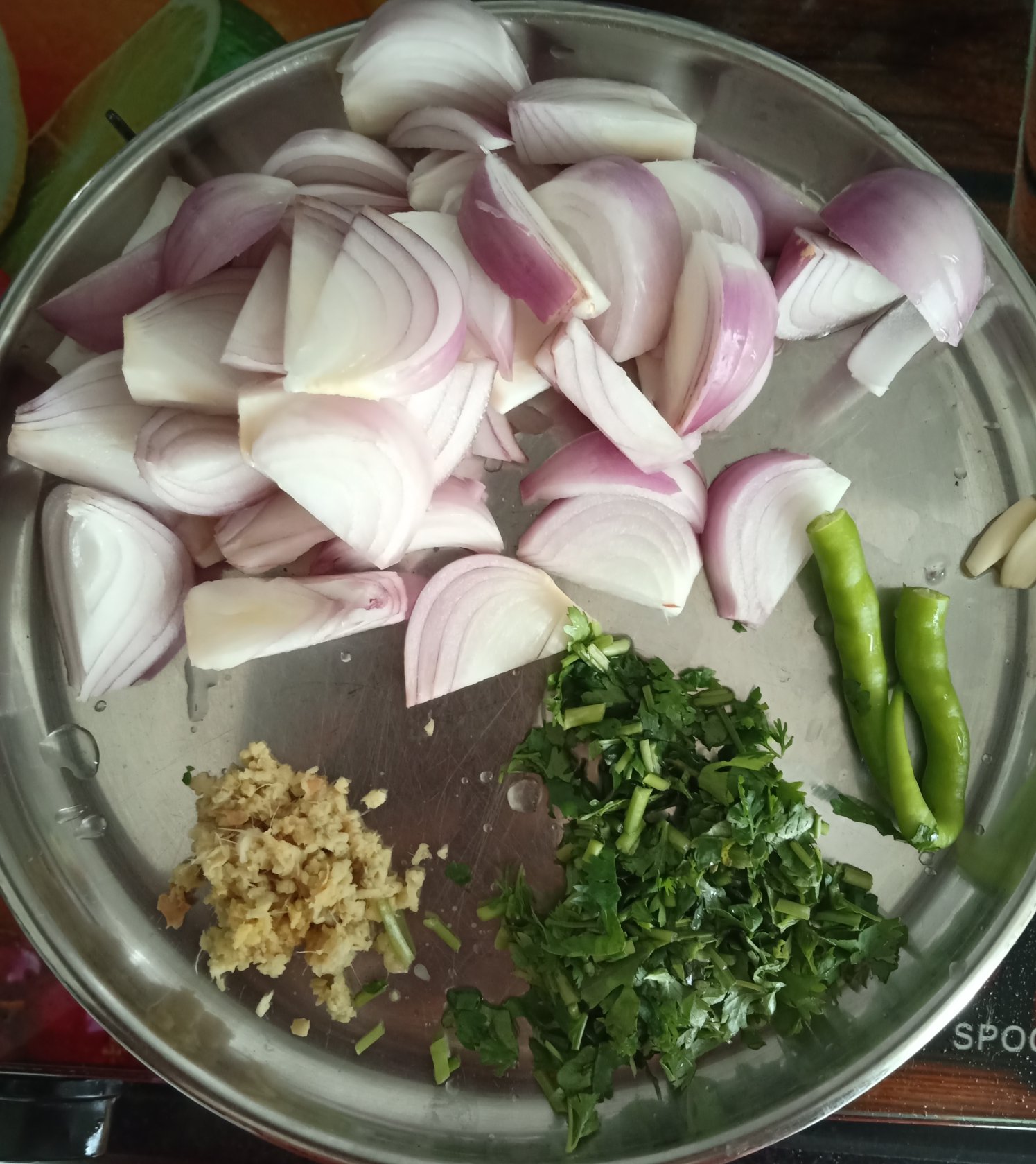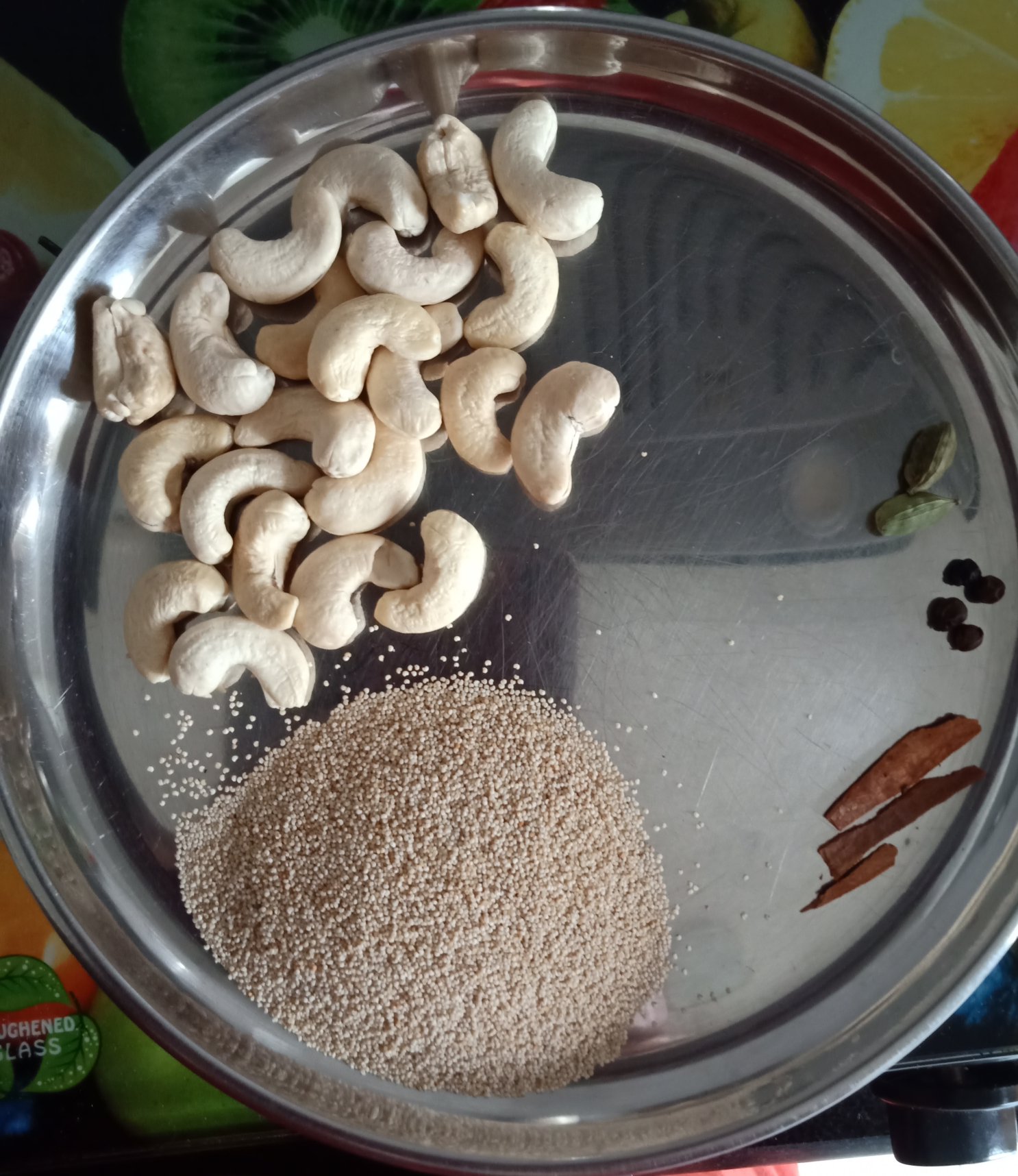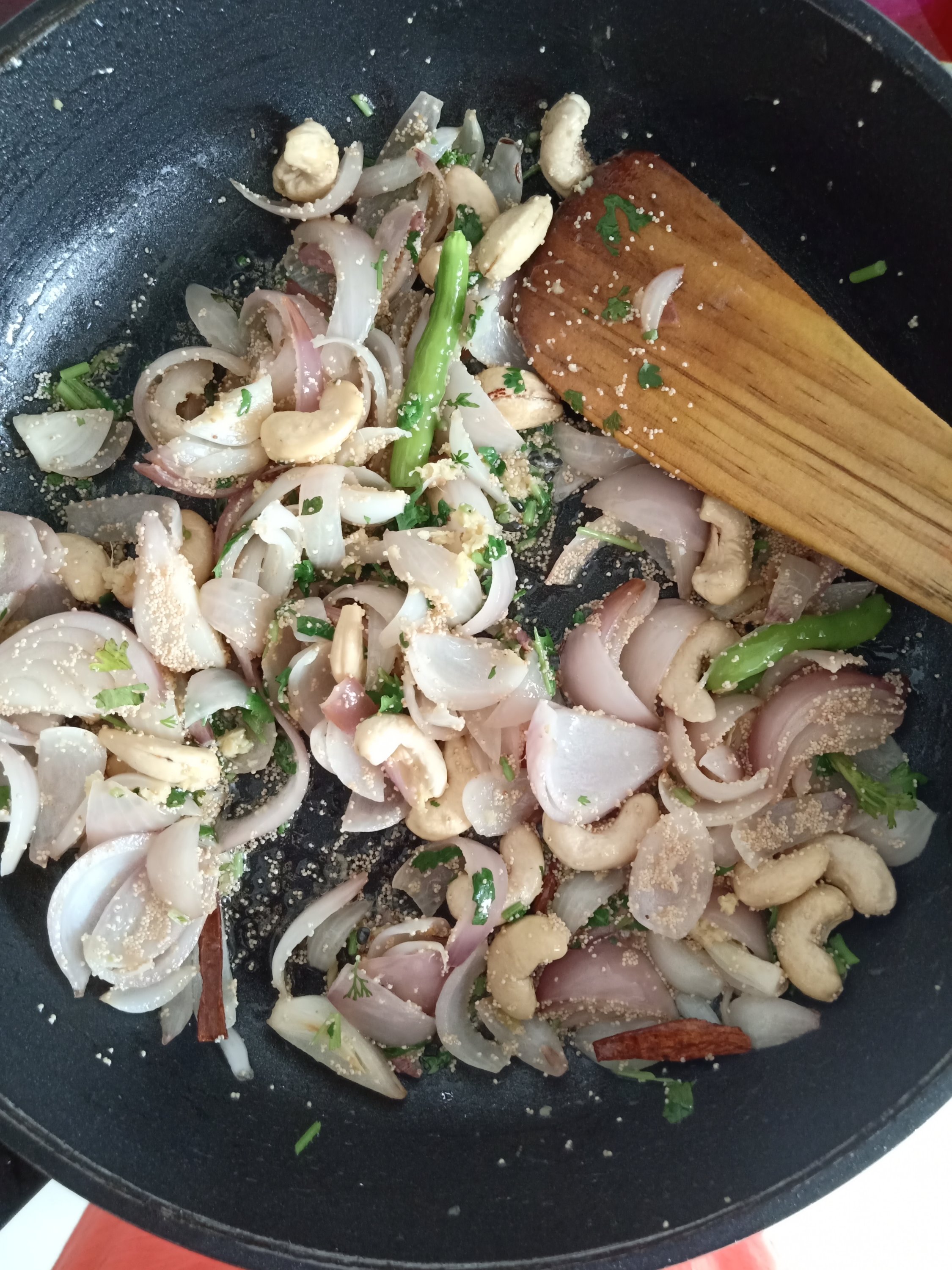 - Heat 2 tbsp. oil in nonstick pan. Add Cumin seeds. Wait for crackling sound and add Asafoetida powder, Cinnamon, Cardamom, Bay leaves, Black pepper, Green chilli, Pieces of Ginger and last Garlic. Soute all spices for 2 minutes and then add Cashew nuts and poopy seeds and salt. Soute till Cashew nuts turns crispy. Now add Onion pieces.