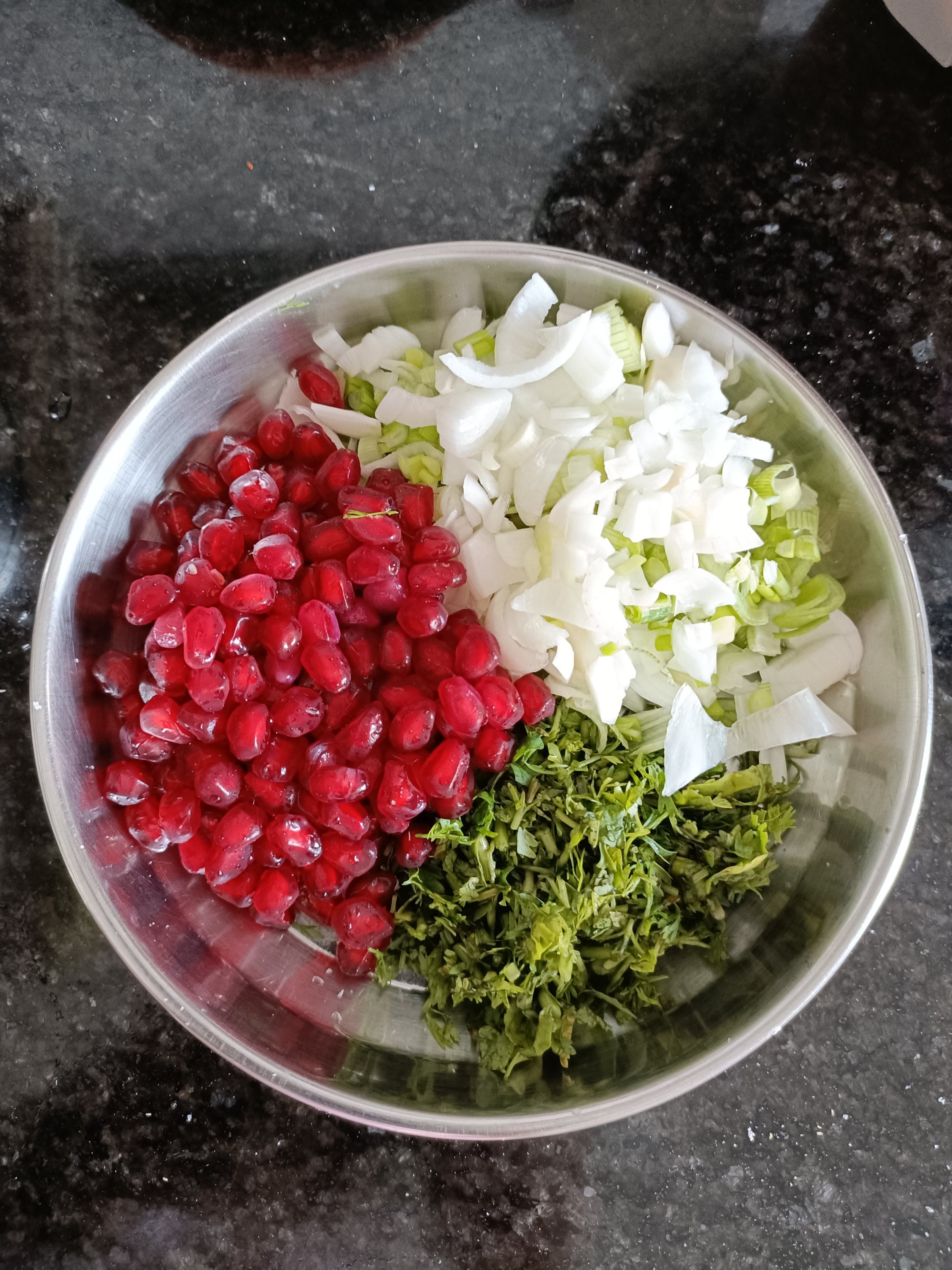 5. In a mixing bowl mix chana, chopped Coriander leaves, Pomegranate seeds and chopped onion and salt and chilli powder.