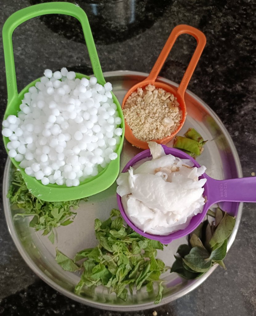 1. Wash Sabudana 2 times and soak overnight or 6-8 hours in ½ cup of water. When you soak sabudana with an equal quantity of water then the final result will always be dry and soft sabudana  otherwise more water results in sticky sabudana.