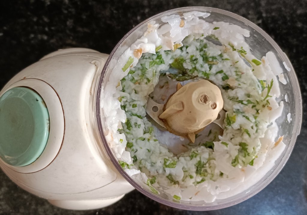 4. In an electric chopper chop tender coconut, phudina leaves, coriander leaves and green chilli together.Keep aside.
