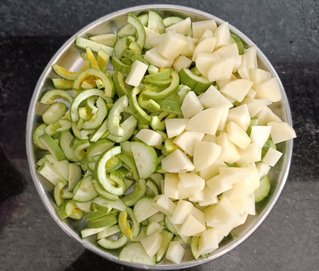 - Wash and scrape each Parwal with a sharp knife. Again wash and cut into 2 halves and again cut either vertically or horizontally into small pieces.