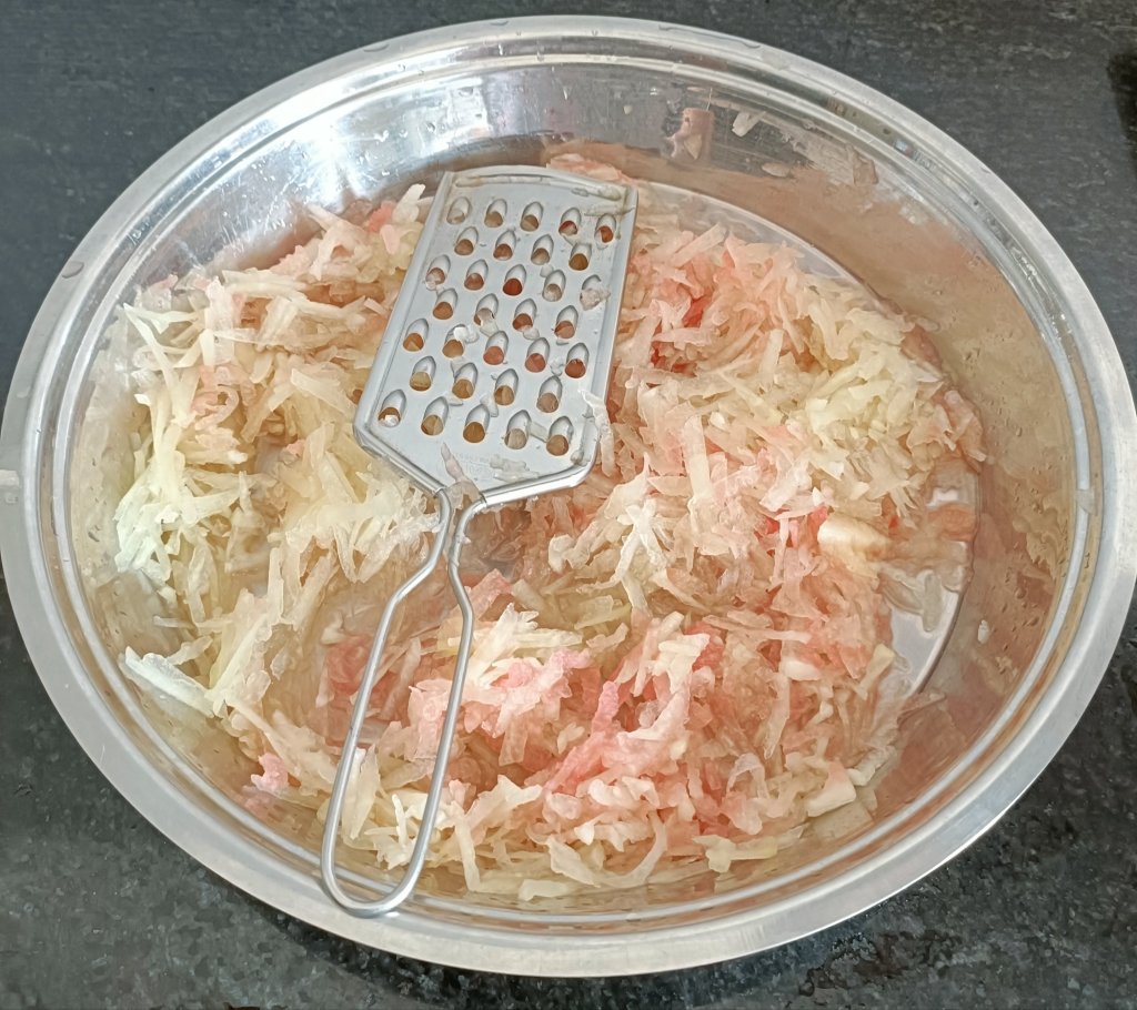 - Peel green part of the Watermelon Rind and then grate each rind with the grater.