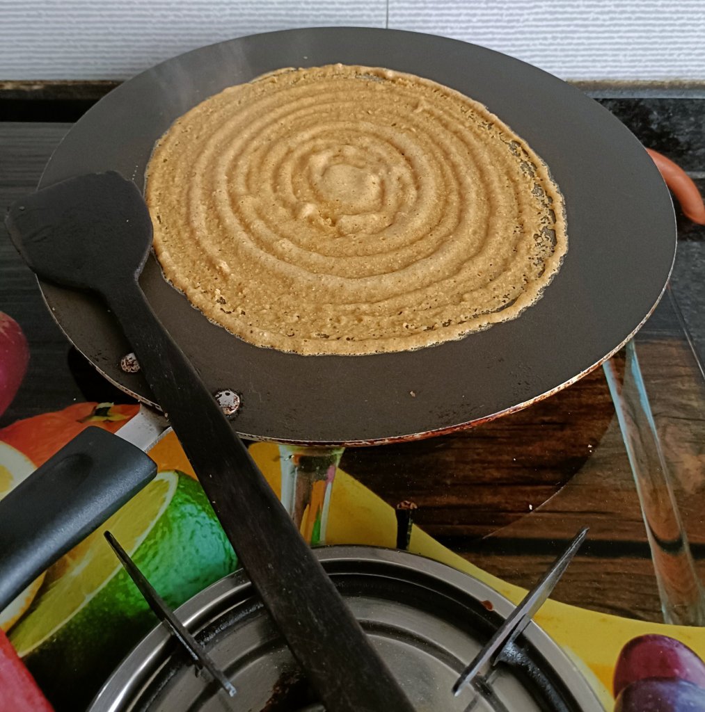 - Heat nonstick tawa and turn the flame slow and now spread evenly the batter in a circular manner.