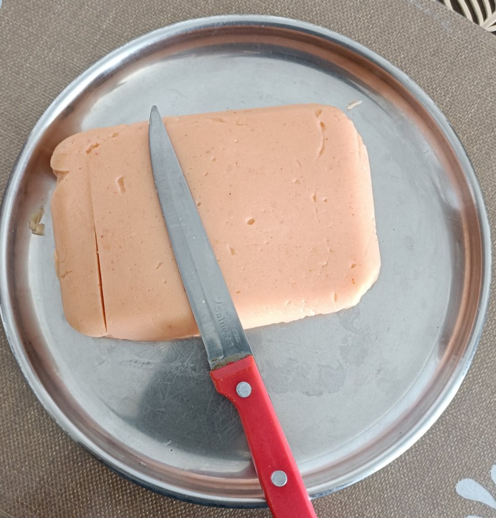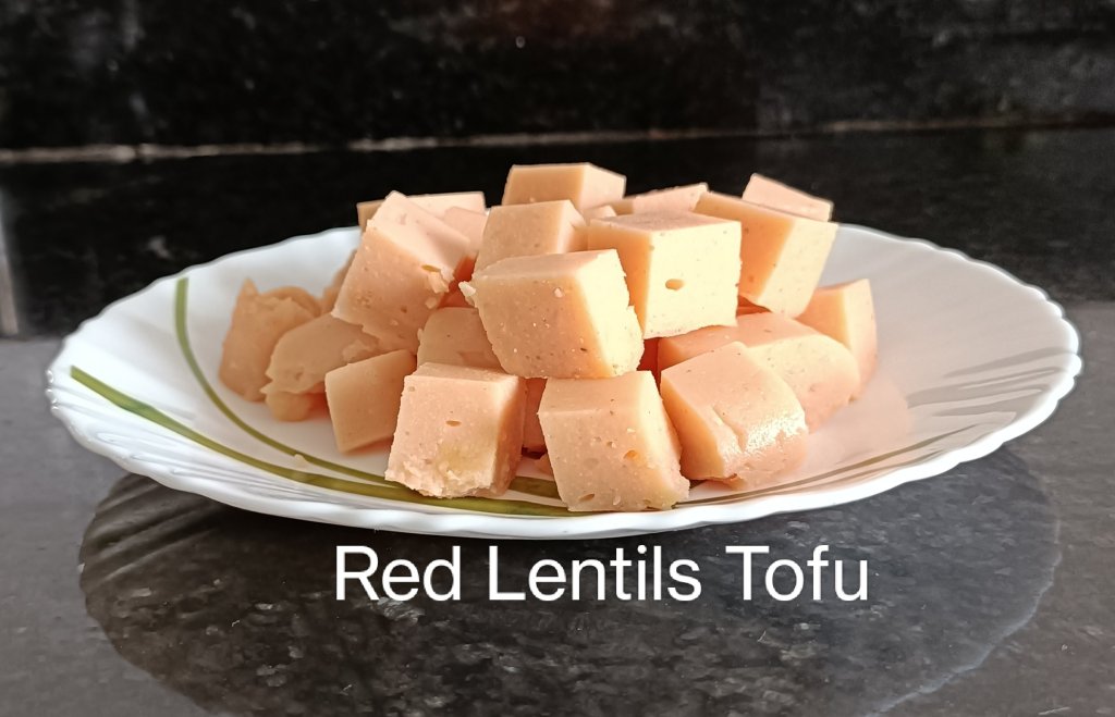 - After 4 hours unmould the container and you will get a nice pink block of red lentils tofu.
