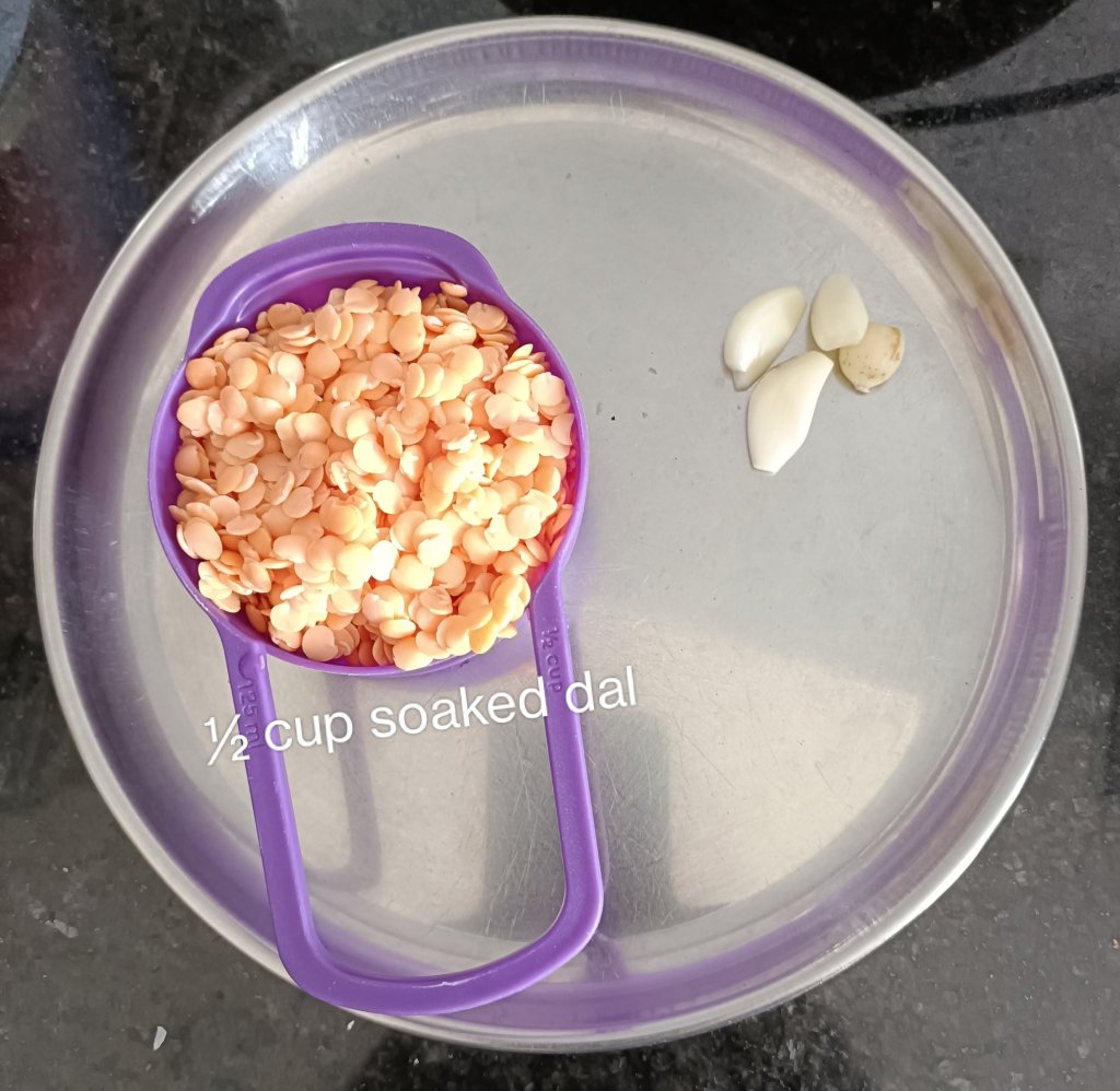 - Drain water from the dal and grind into fine paste by adding ¾ cup of Water, Salt and Garlic.