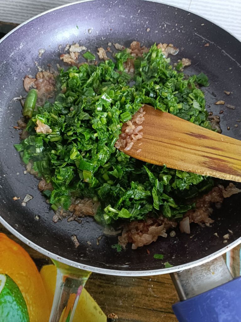 - Now add chopped spinach and saute till it becomes tender.