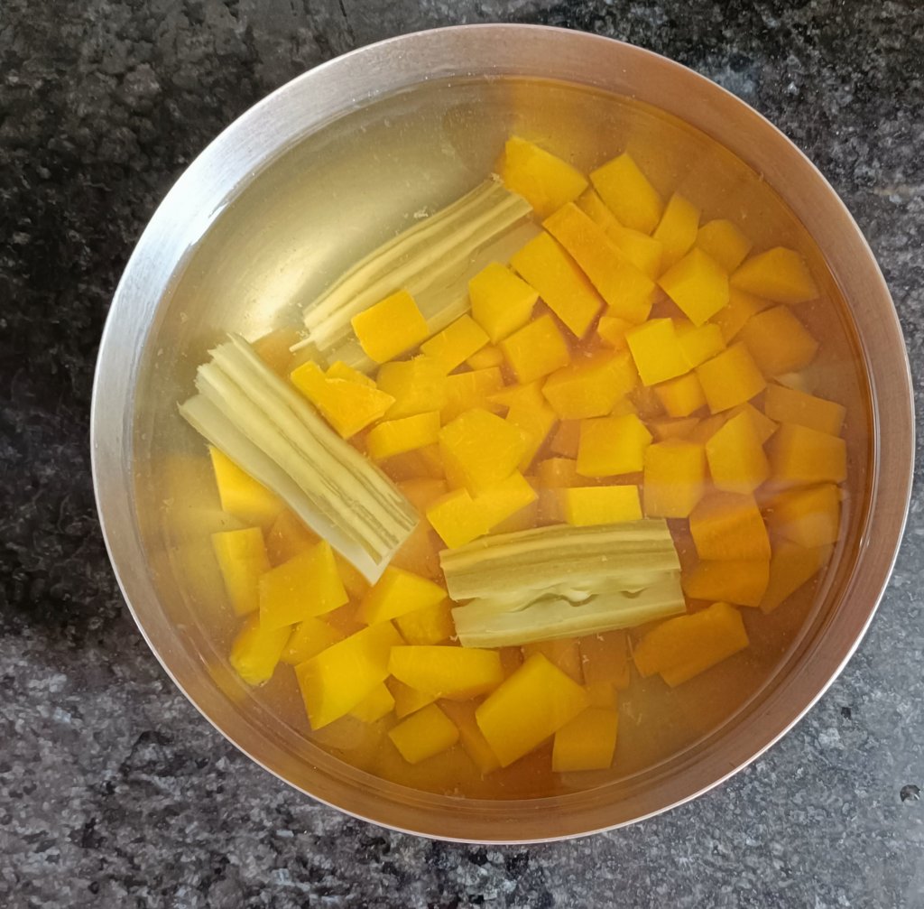 1. Wash and peel the Pumpkin and cut it into small dice.