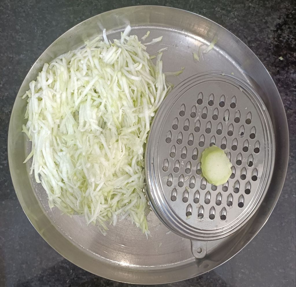 - Grate bottle gourd with bigger diameter grater to get thick grated Bottle guard.