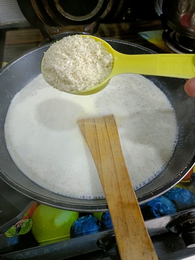 - Heat milk in a nonstick pan and when it starts boiling, mix coarse powder of makhana in milk.