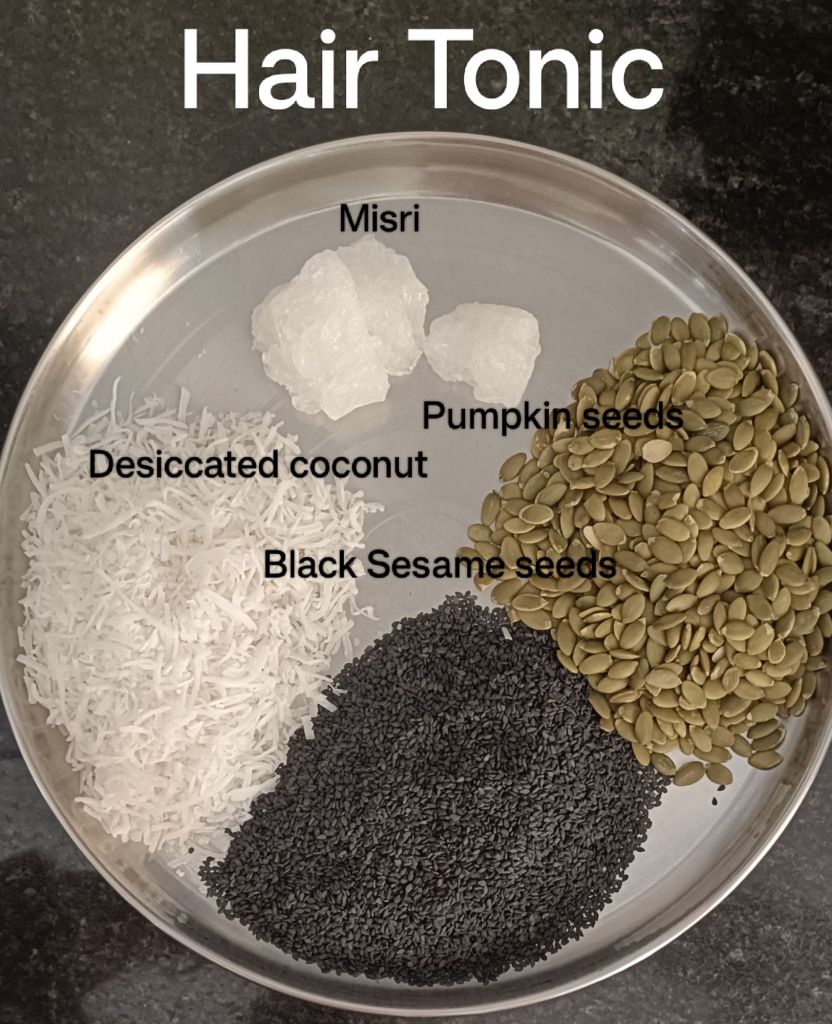This wonderful and nutritious hair tonic powder,  where each of its ingredients has its own benefits. Black Sesame seeds help in strengthening hair, prevent premature graying and promote healthy hair growth. Dry coconut nourishes the scalp, reduces dryness and adds shine to hair. Pumpkin seeds improve scalp health , strengthen hair follicles and reduce hair fall . Misri  has cooling effects.