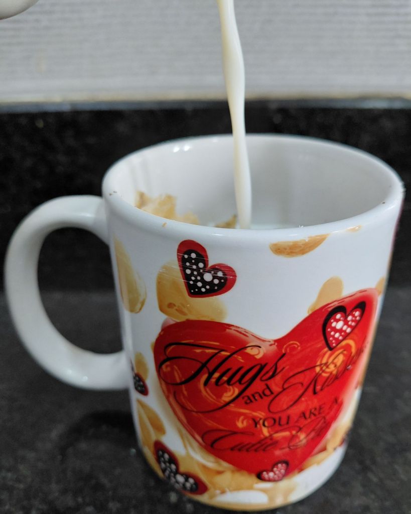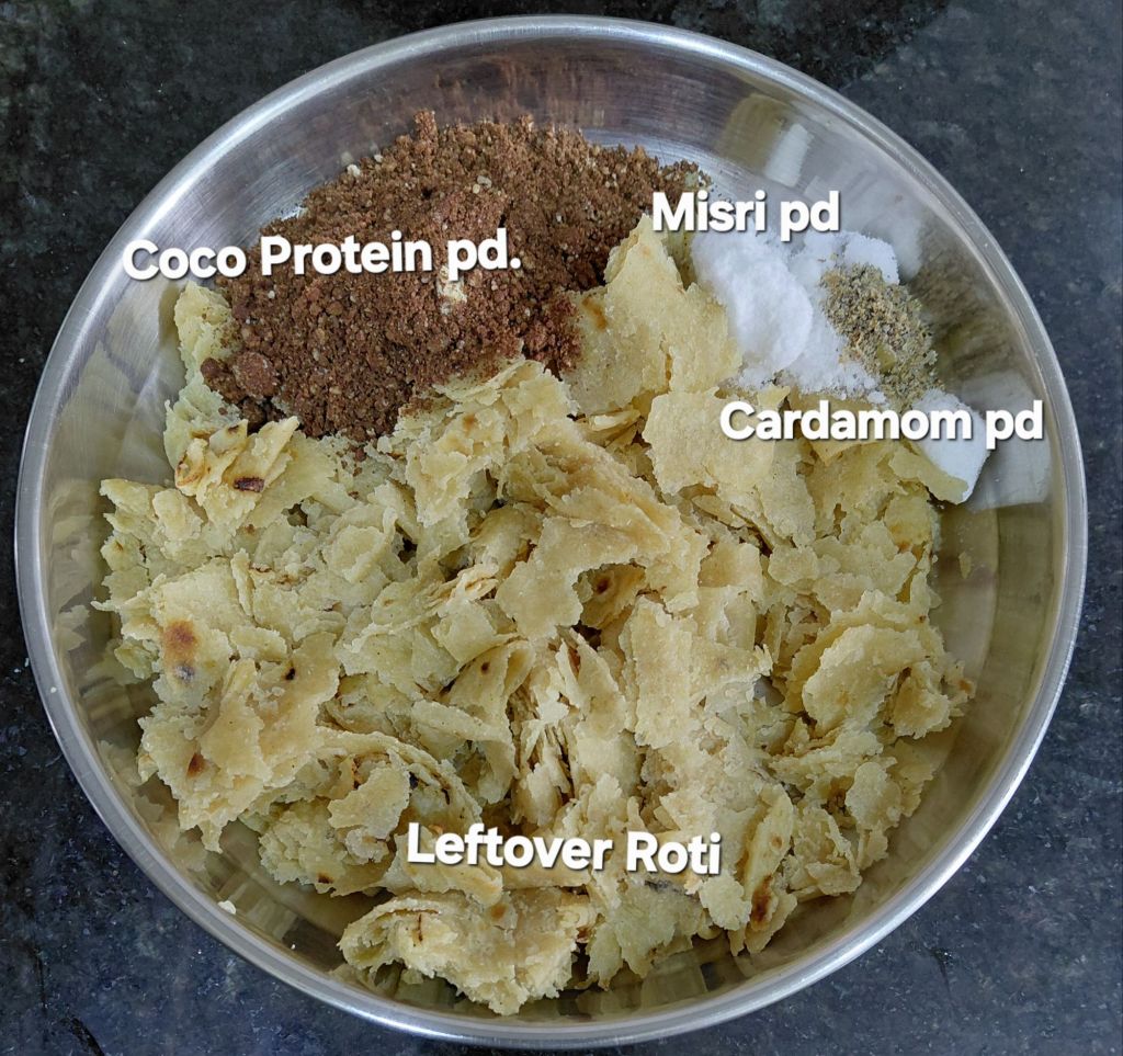 2. First pour chilled milk in a cup. Add misri powder, roti pieces and Coco protein powder and mix well.
