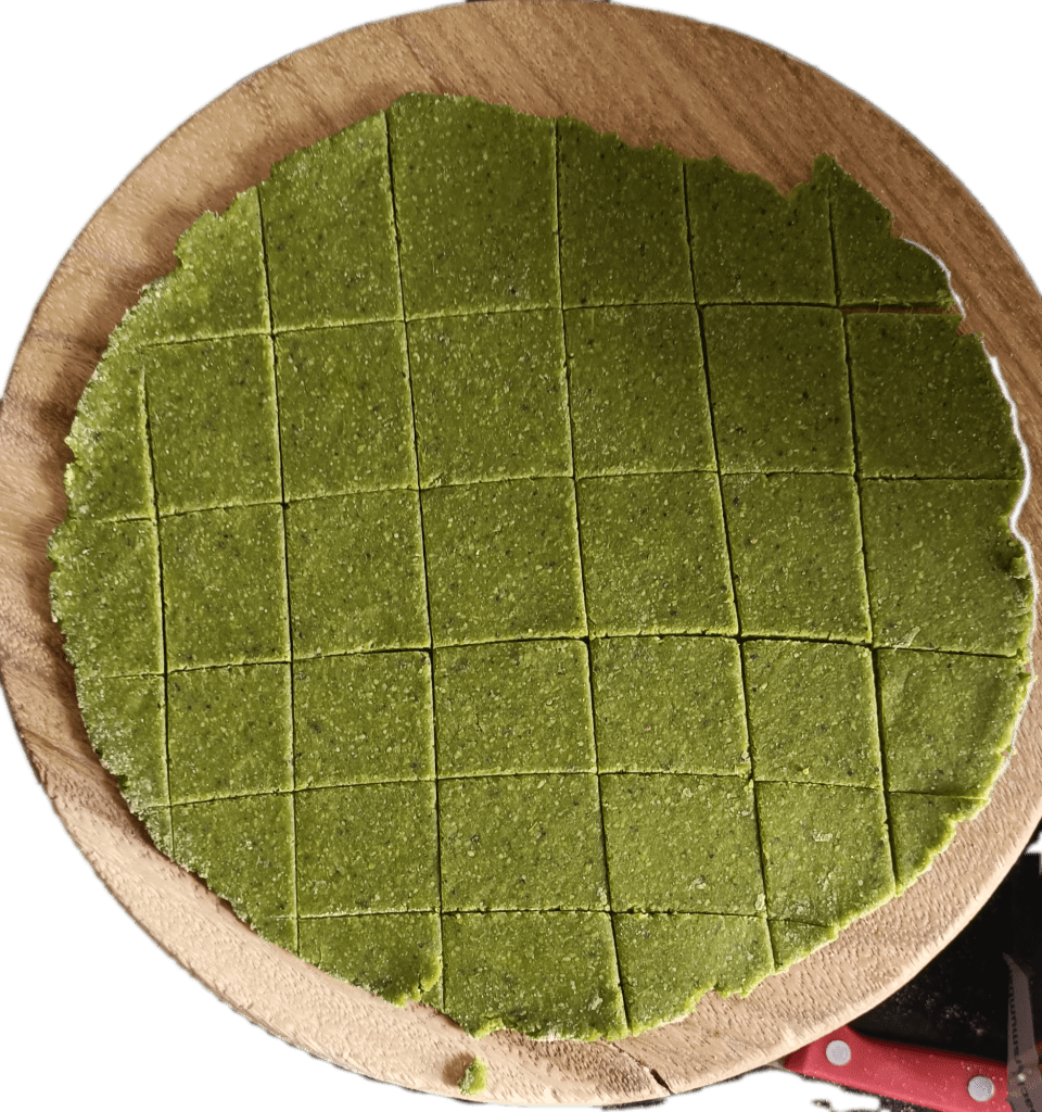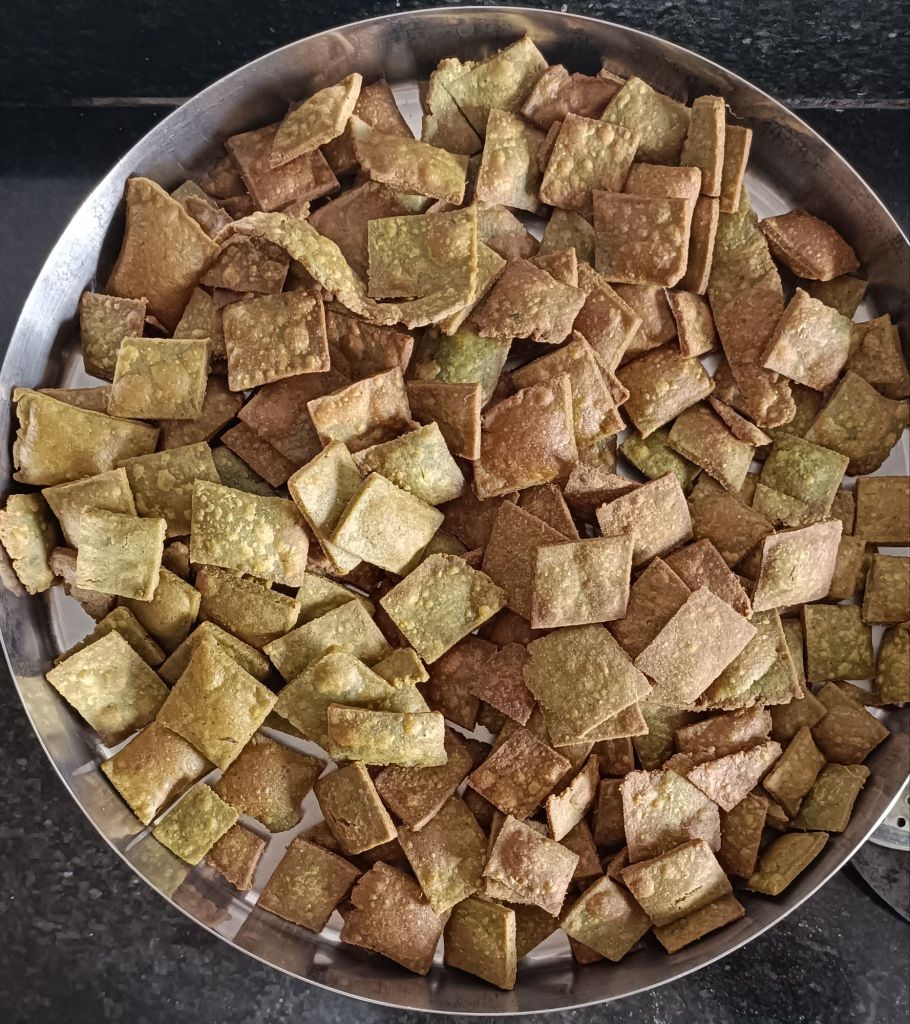 8. Each dough portion roll into 8- 10 inch round roti and when all roties are done then cut it into squre or dimond shape namakpara.