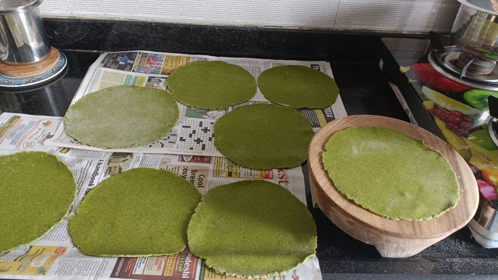 5. Now knead dough by adding palak puree in the flour.