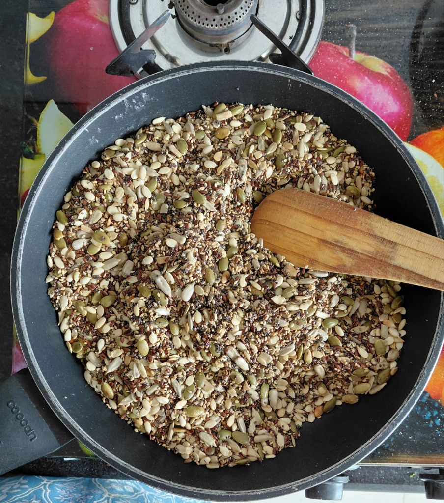 - Once all seeds roasted, mix them in the same pan on the slow flame and pour ghee and stir well so that all seeds become greasy.