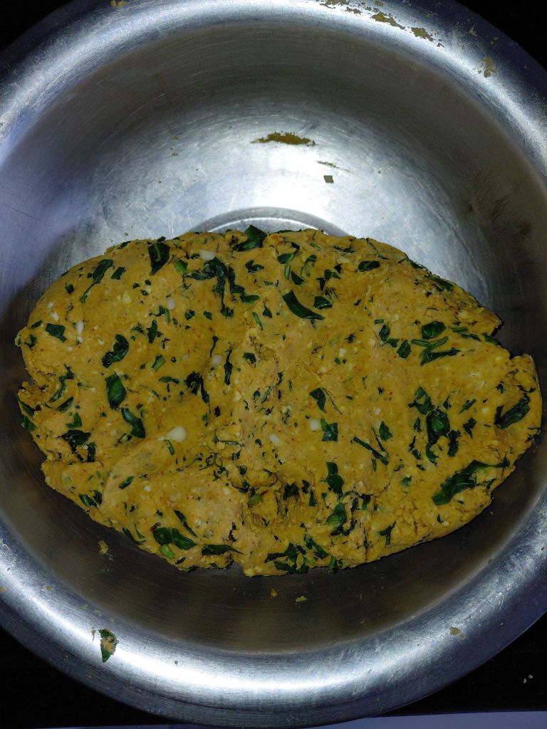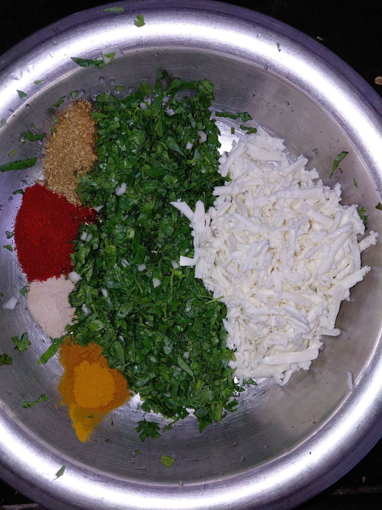 - In a mixing bowl mix Spinach, Coriander leaves, Paneer, spices, salt, sugar and curd. Mix well and keep aside for 10 minutes.
