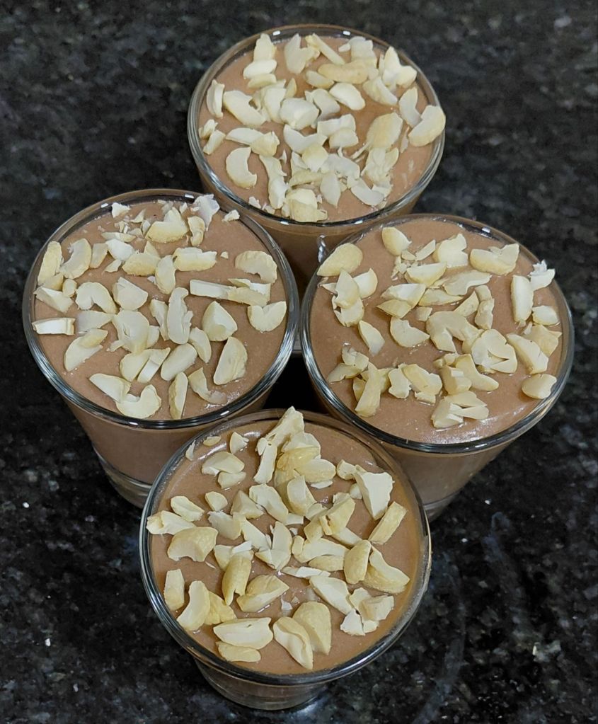 6. Fill the shot glasses with Mousse and garnish them with chopped Cashews.