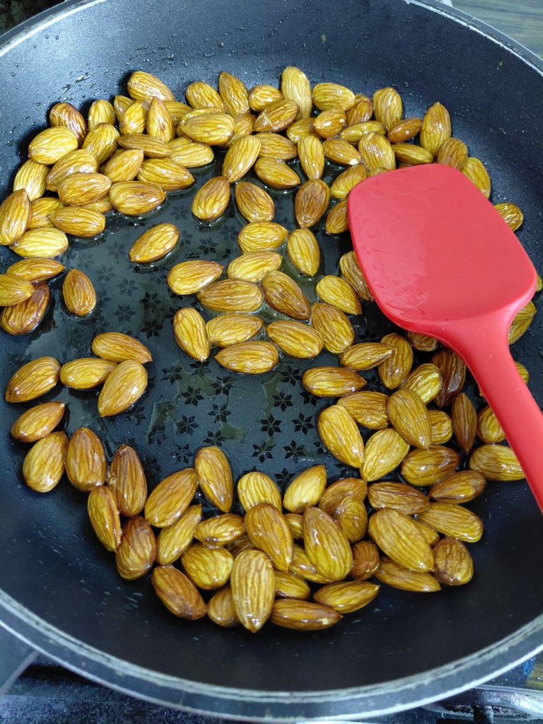 - In the same pan add 1 tbsp. of ghee and roast Almonds on slow flame. Keep aside.