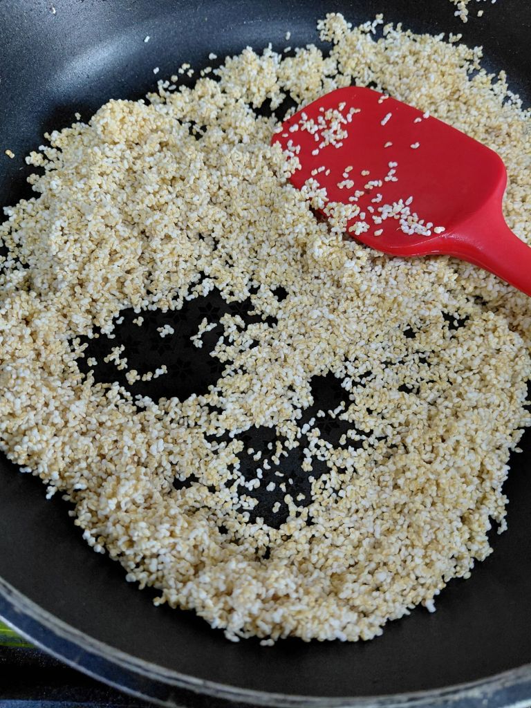 - In the same pan add 1 tbsp. ghee and roast popped Amaranthus for one minute on a slow flame and keep aside.