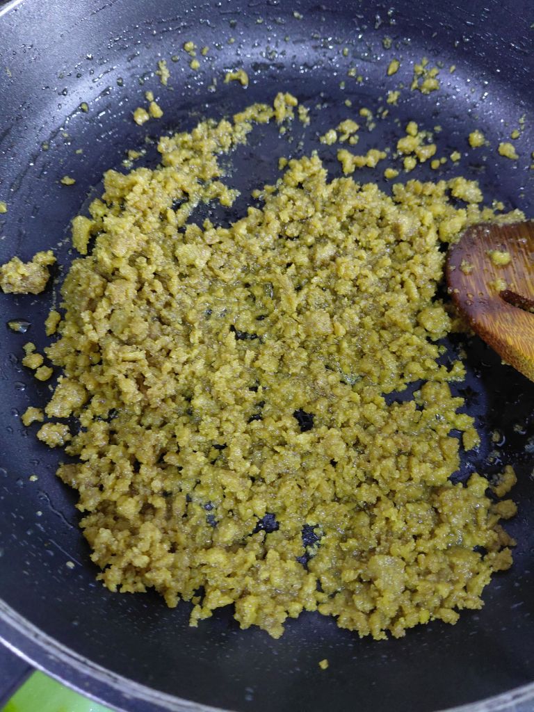 - Again heat ½ cup ghee in the same pan and roast soaked methi powder. Soaked methi powder is in dough form so first break the dough with the hands and then roast. It will take 15 to 20 minutes on a slow flame so do not lose patience. When it changes the colour switch off the flame and keep aside.