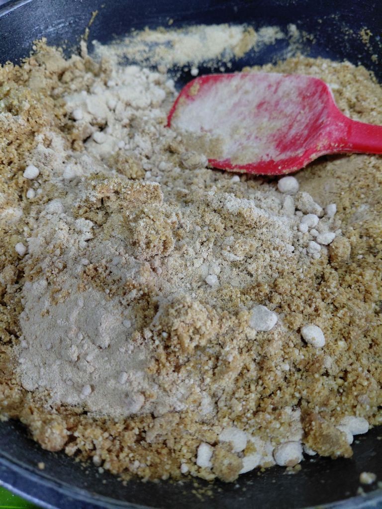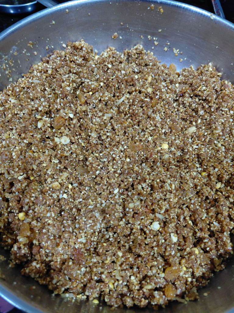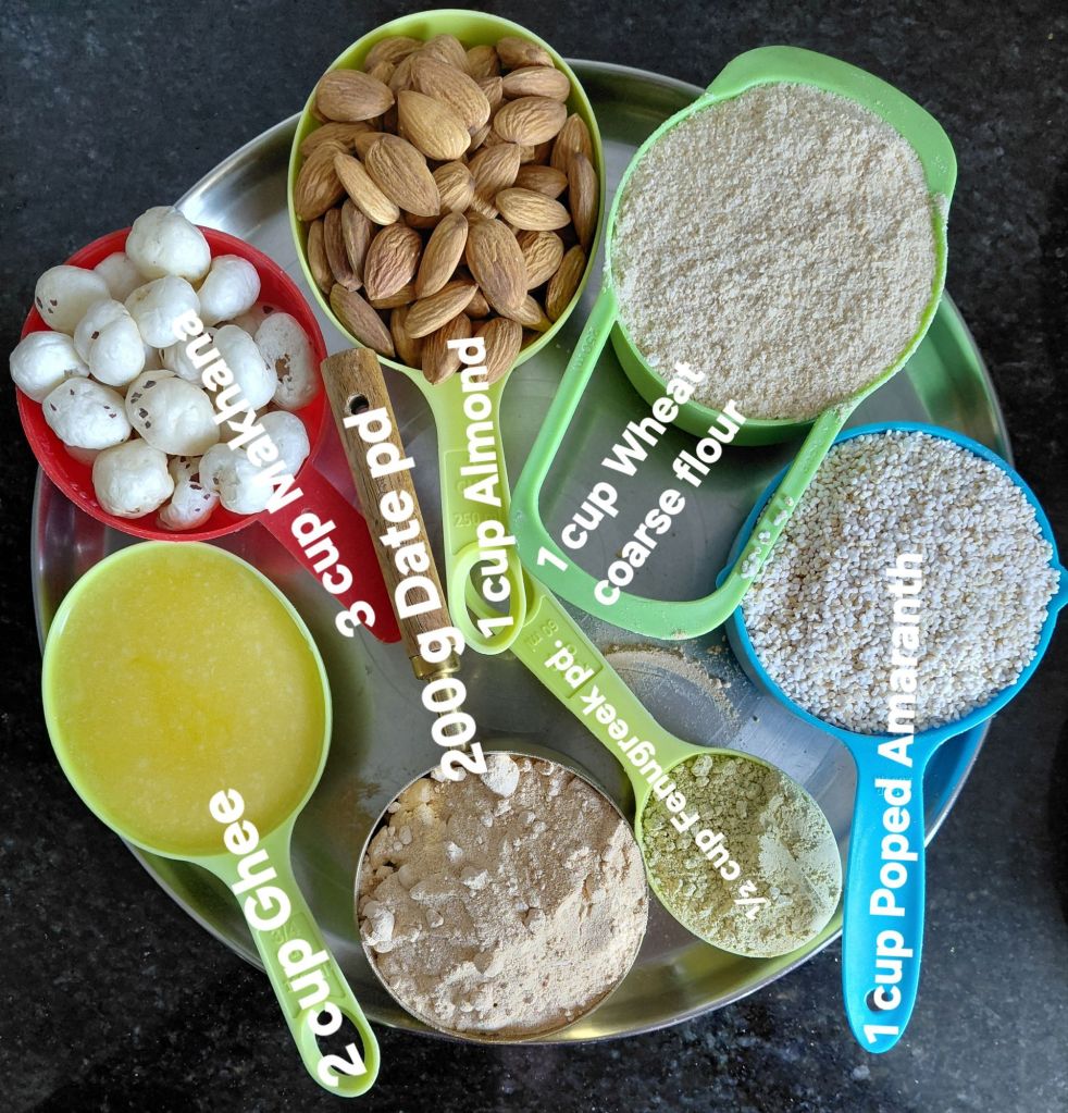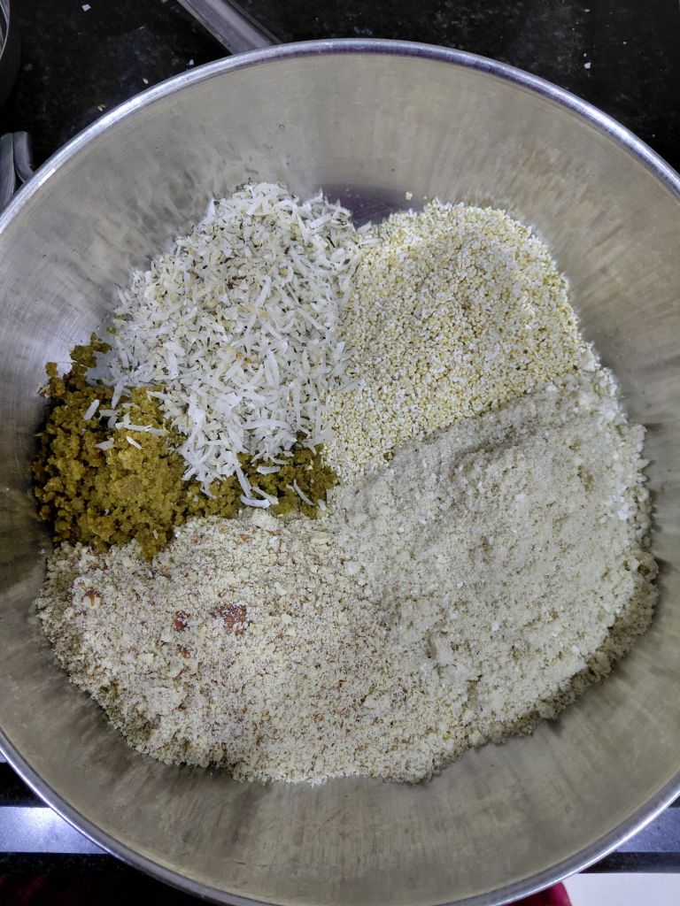 - In a big mixing bowl mix Makhana powder, Almond powder, Oats powder, popped Amaranthus, Roasted Coconut, Methi powder, Wheat flour, Fried Gond powder, Kharek powder and Batrisu katlu powder and remaining ghee. Mix well. Now add Date syrup and mix well. Methi laddu mix is ready.