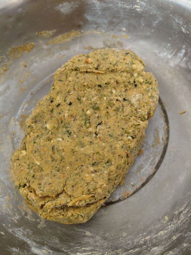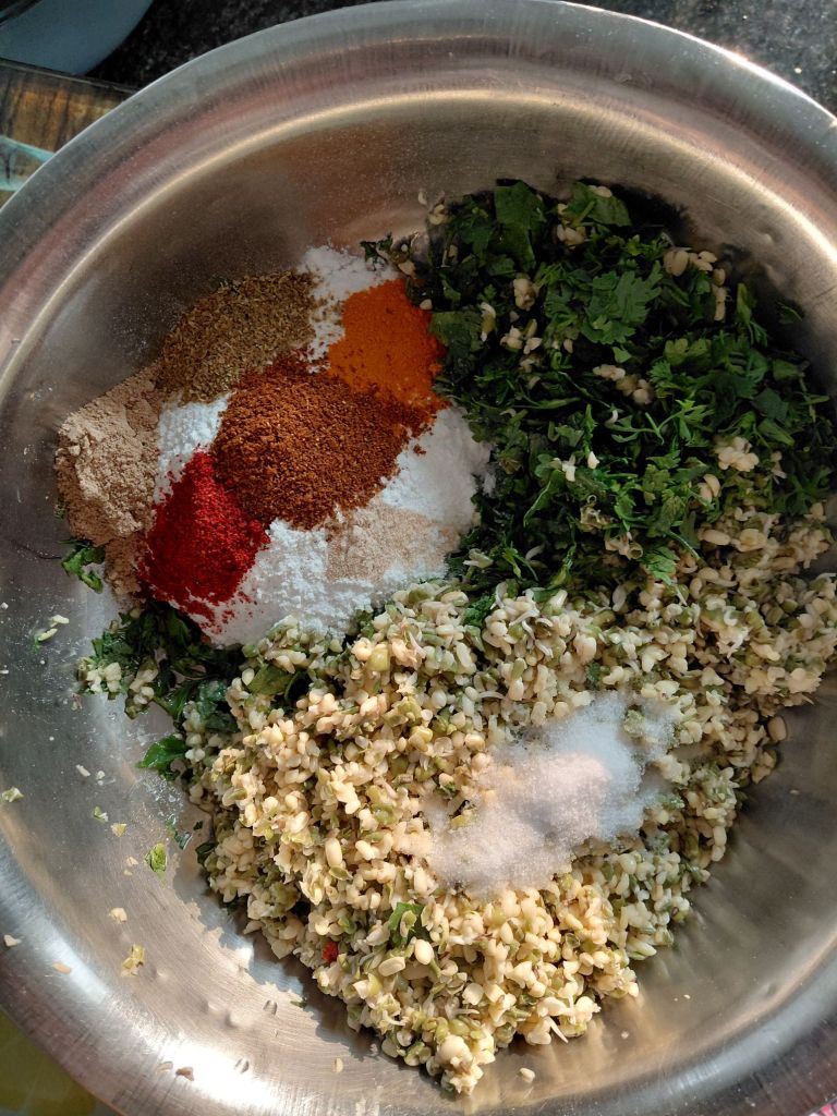 - In a mixing bowl, mix sprouts batter, all dry spices, chopped Coriander leaves and rice flour. Knead into a soft dough. If required, add little water to knead.