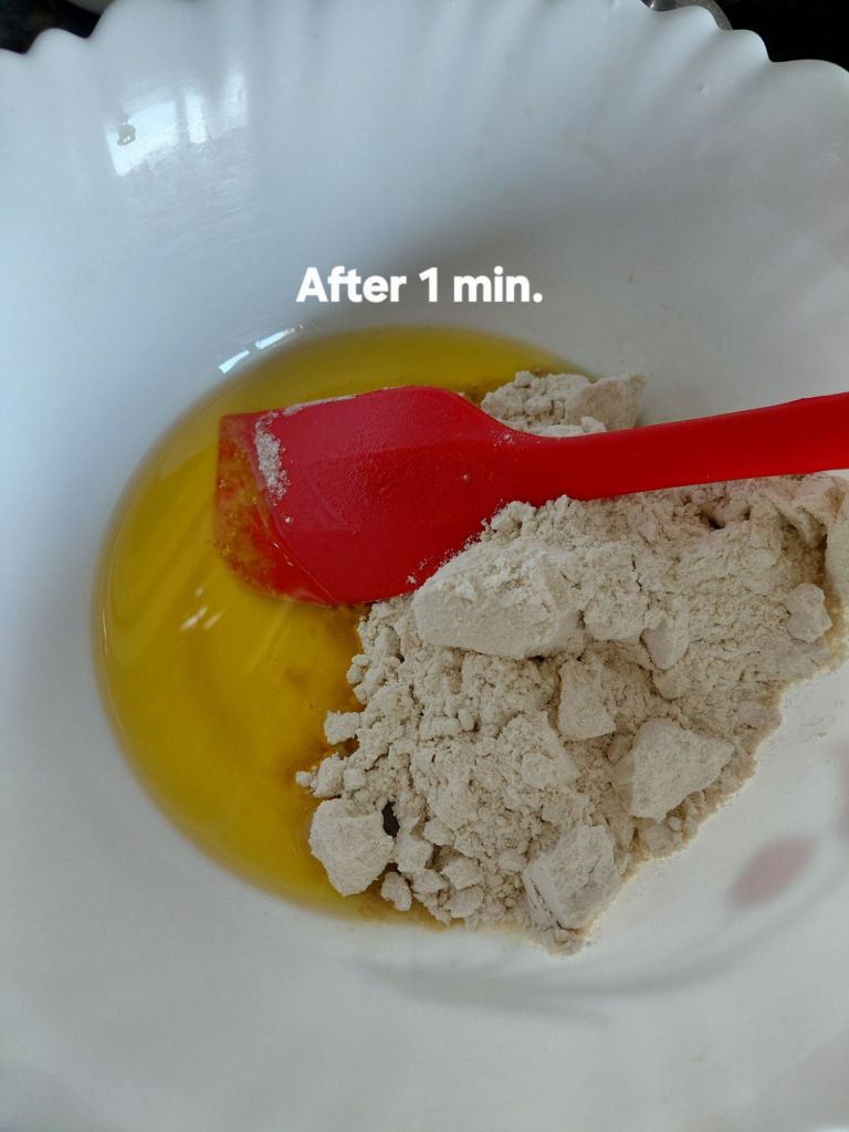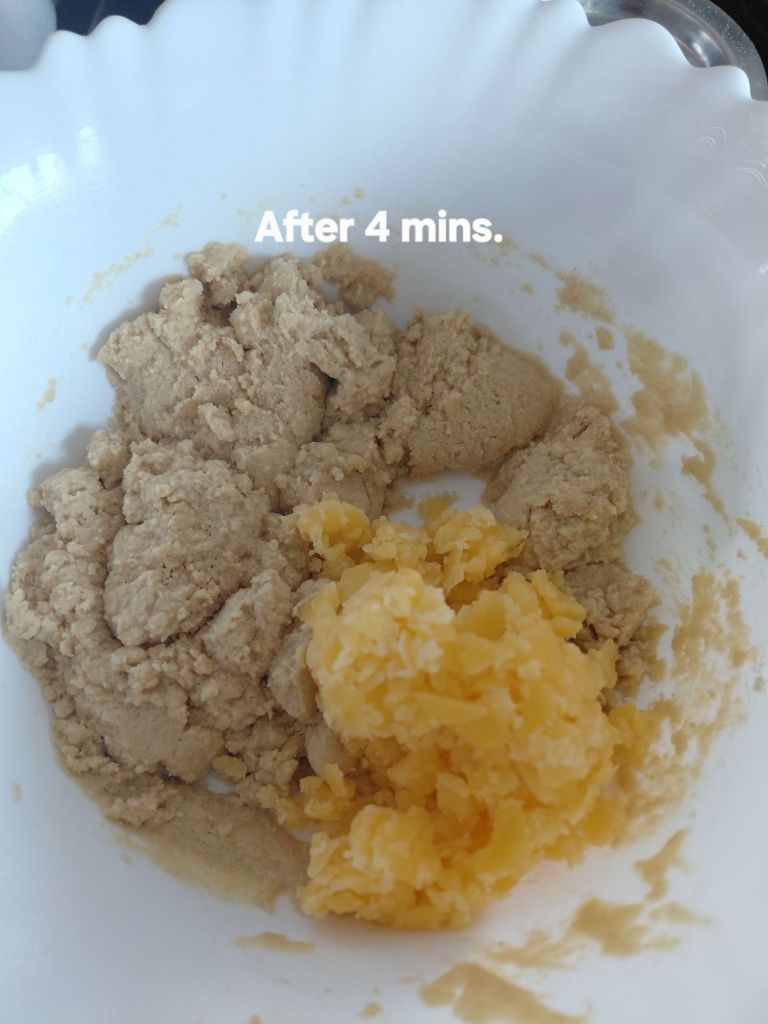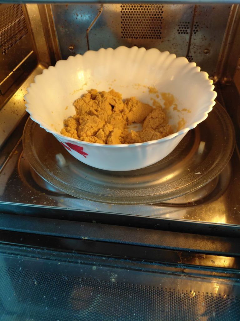 - Remove the bowl from the microwave and mix flour with the ghee.