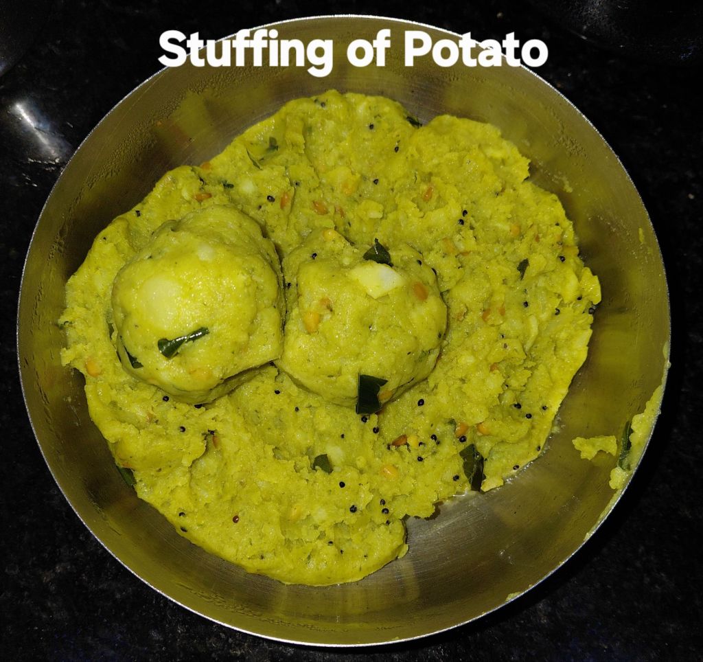 - Heat oil in a nonstick pan and add mustard seeds, wait for the crackling sound and add cumin seeds, Asafoetida and other ingredients, saute for ½ minute and then add potato stuffing. Mix well and saute for two minutes. Switch off the flame and transfer the stuffing in a plate to cool down.