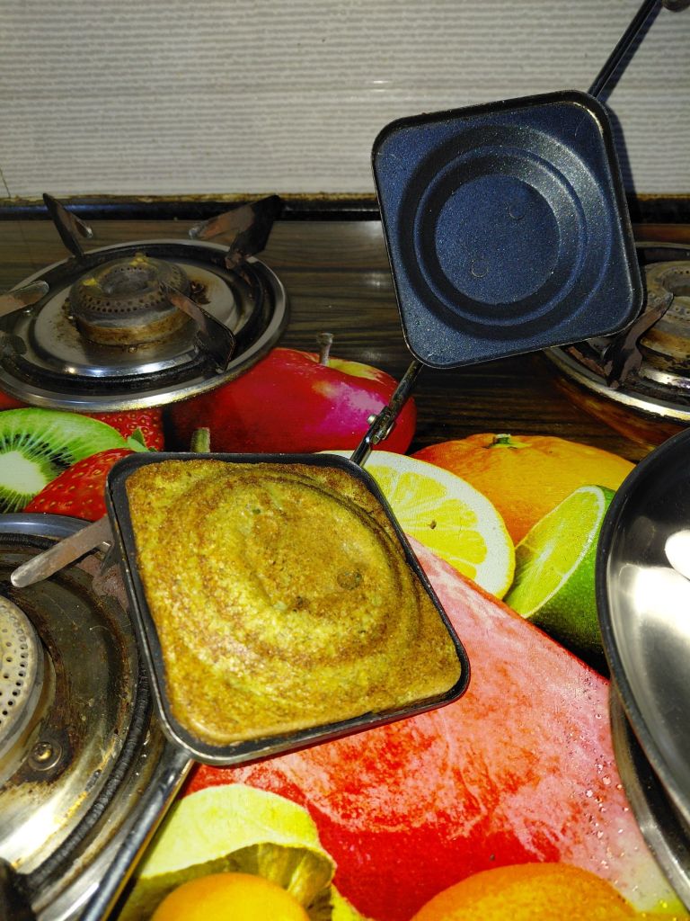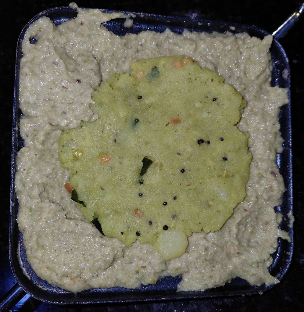 - Pour batter on one side of the greased toaster, place a tikki of potato stuffing in the center and once again pour moong dal batter over it.