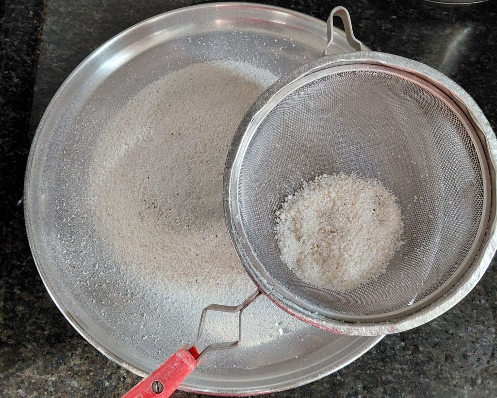 6. Sieve this powder with the help of soup strainer. Either grind the coarse residue again or fill  in the separate airtight container to be used for garnishing.