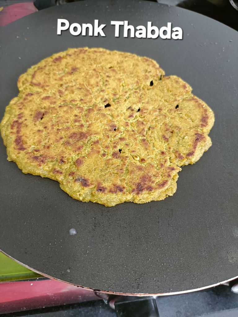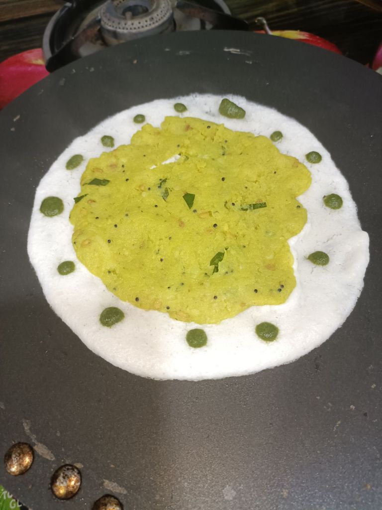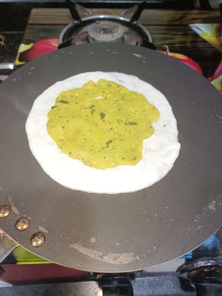 - Heat the nonstick tawa and pour ½ cup of batter. Spread this batter in circular manner and make a dosa.