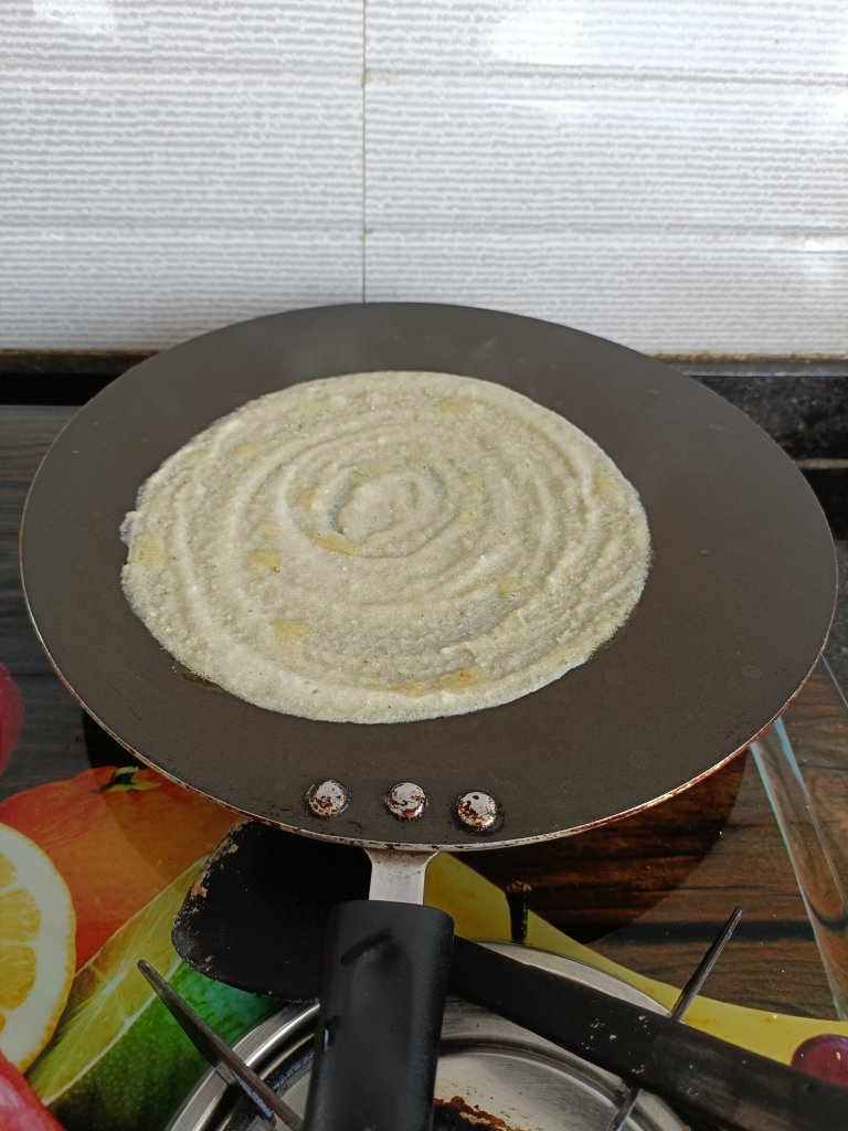- Heat the nonstick tawa and pour ½ cup of batter. Spread this batter in circular manner and make a dosa.