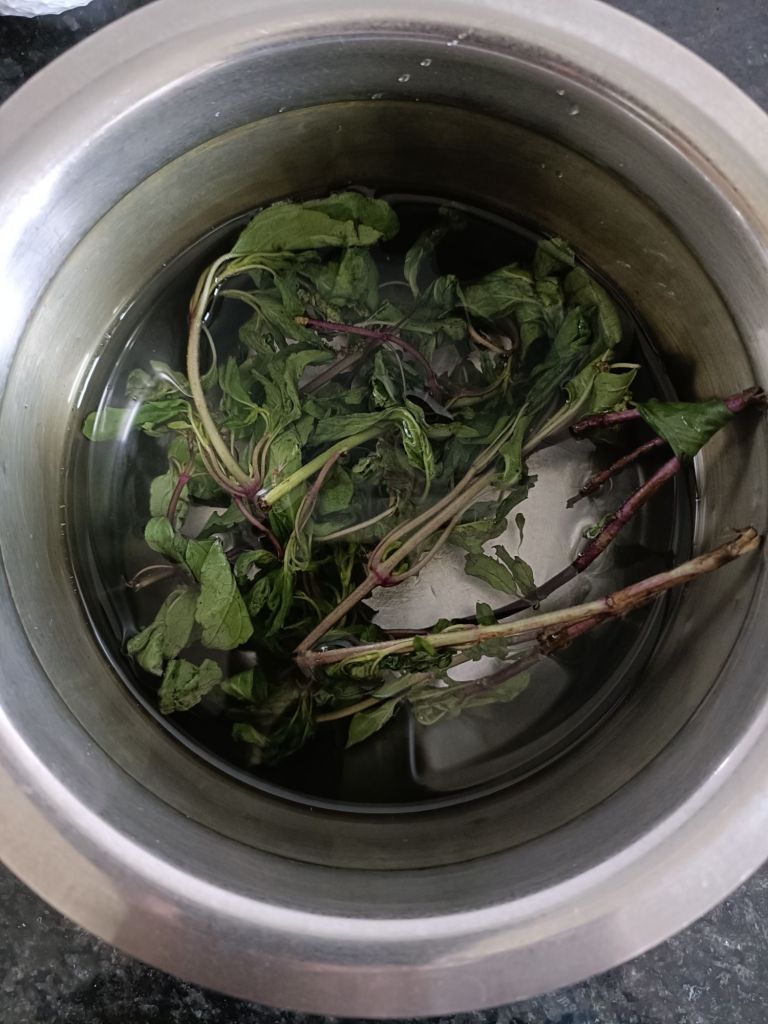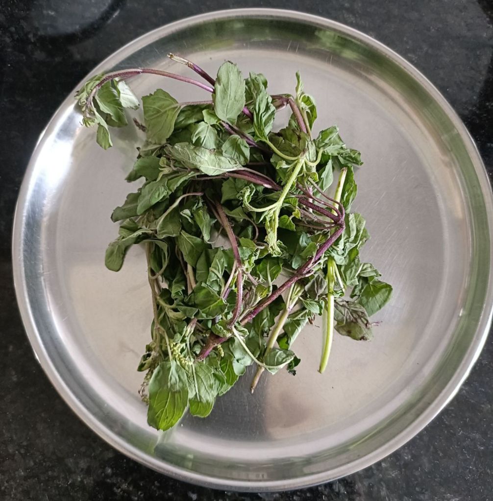 Wash and pluck holy basil leaves and mint leaves from its stalk and keep aside.