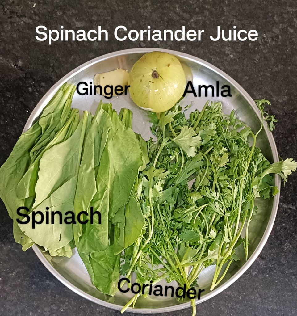 - In a mixture grinder add ½ cup water,Spinach, Coriander, chopped Ginger and deseeded chopped Amla. Grind it into a smooth paste.