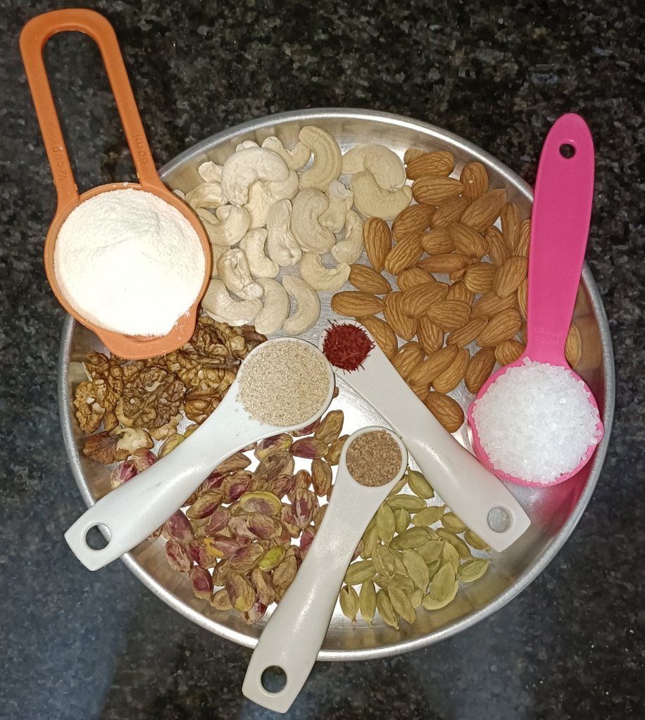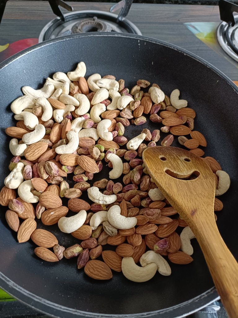 Heat nonstick pan. Dry roast all nuts in a nonstick pan on a slow flame for 2 minutes only. Keep aside to cool.