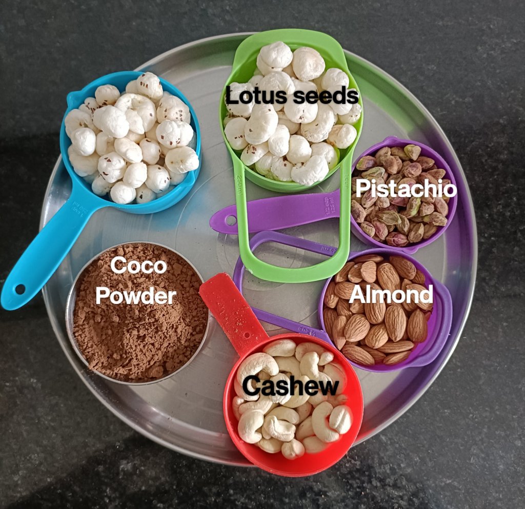 Mix thoroughly Coco powder with coarse powder of dry fruits and makhana.