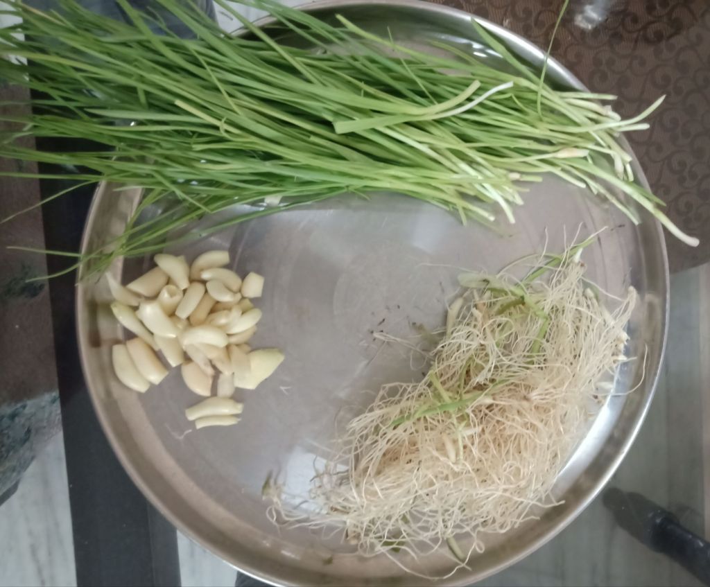 Finely chop Garlic leaves. Wash it in wire mesh and keep aside.