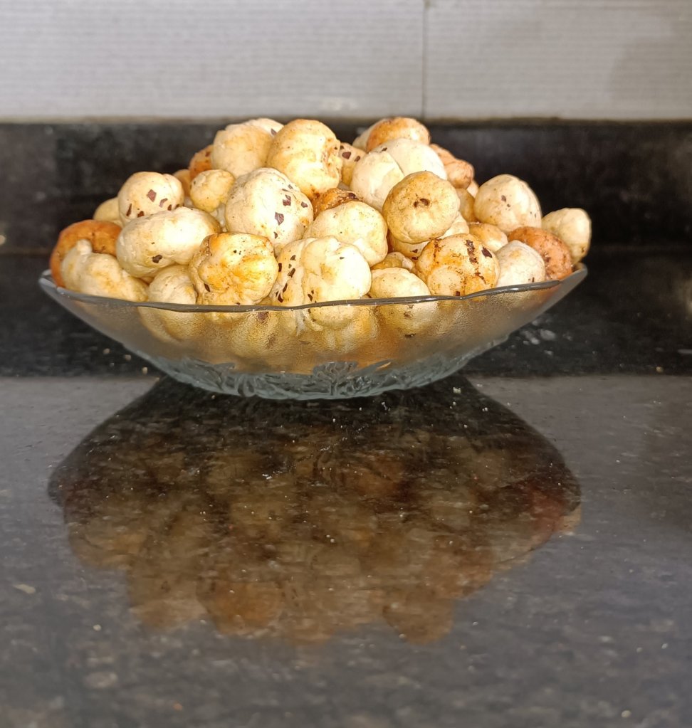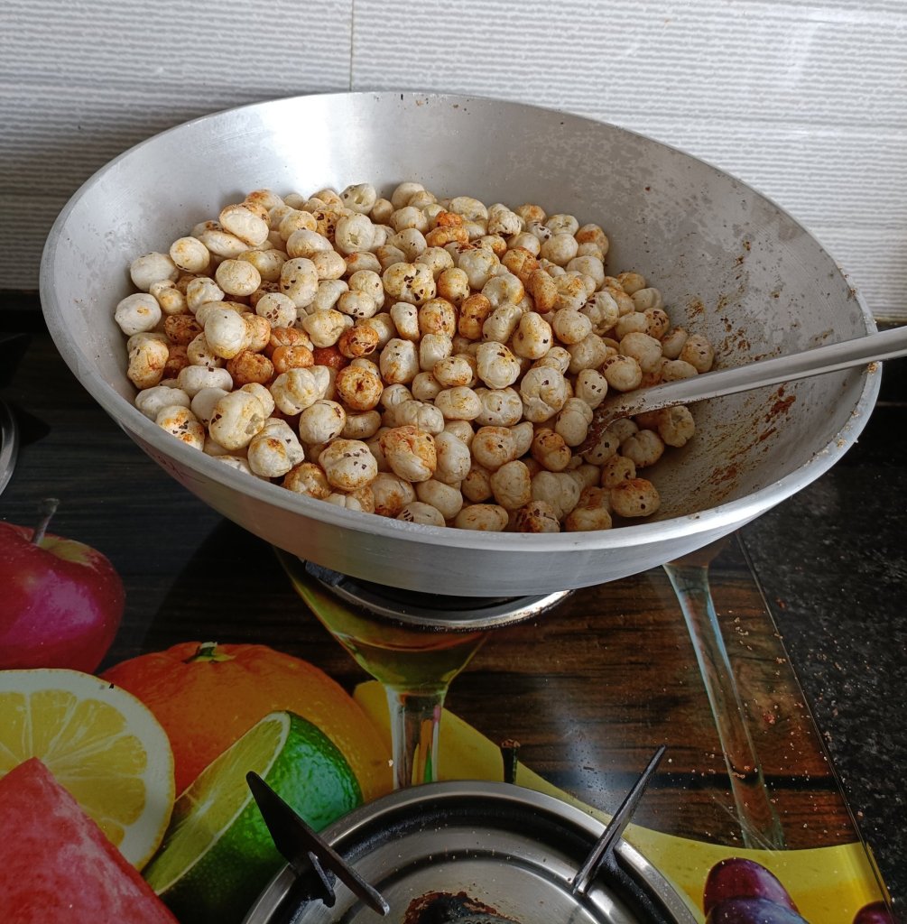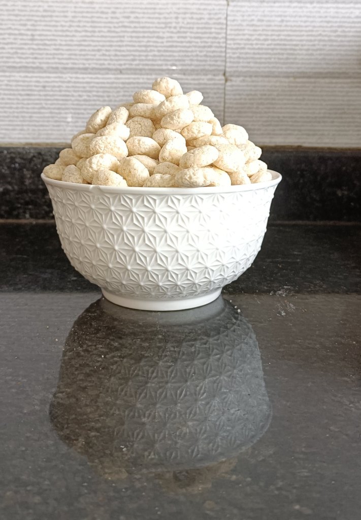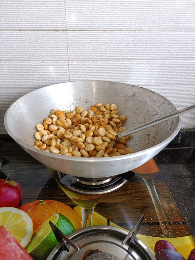 Check a single piece of kurmura by pressing in between finger and thumb. If it breaks and forms powder it means kurmura are properly roasted. Keep aside.