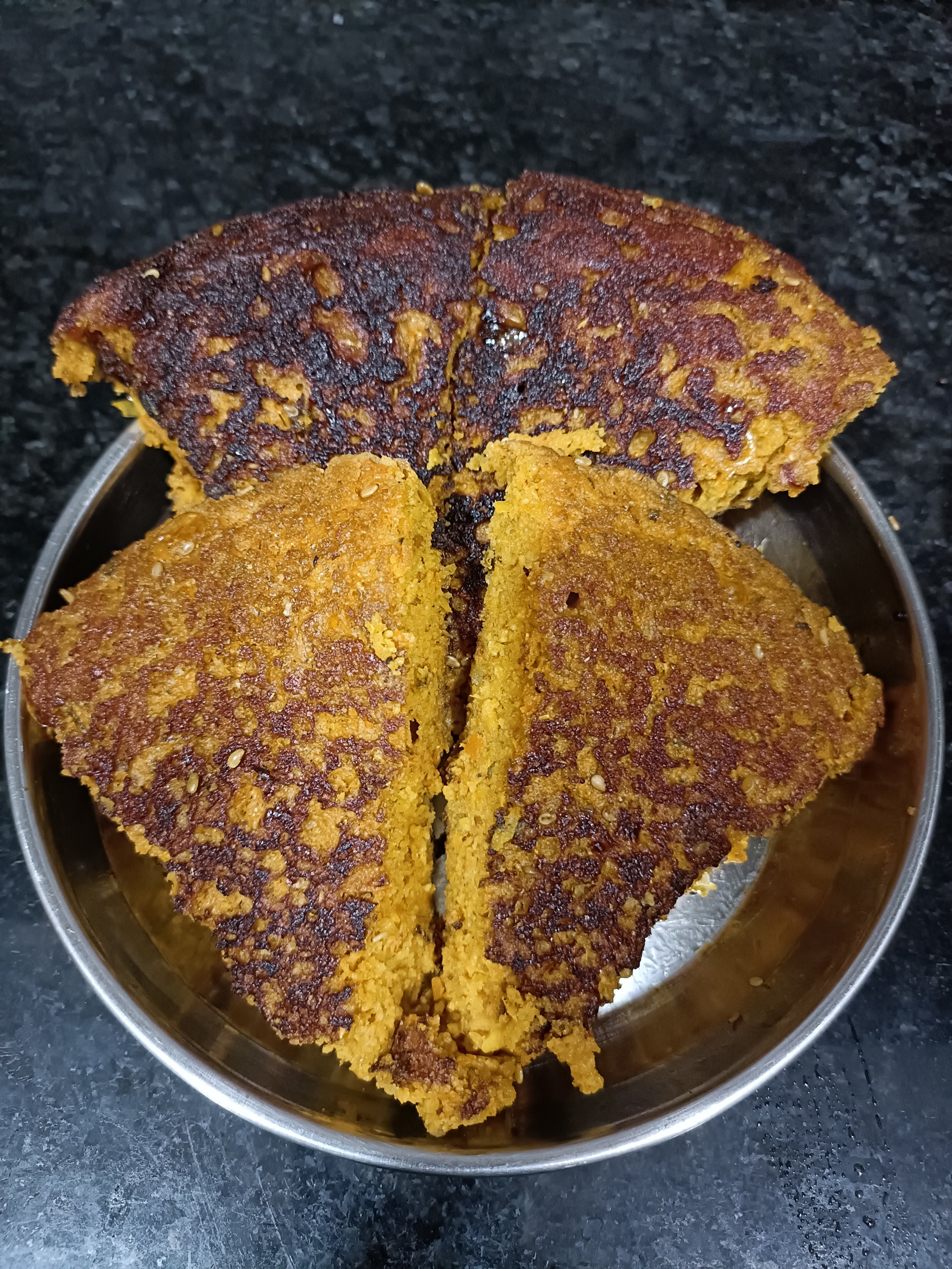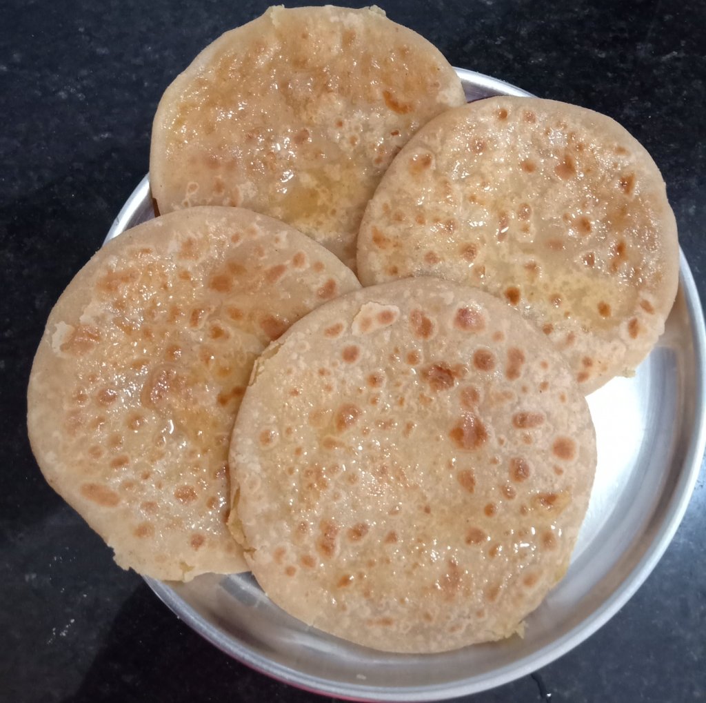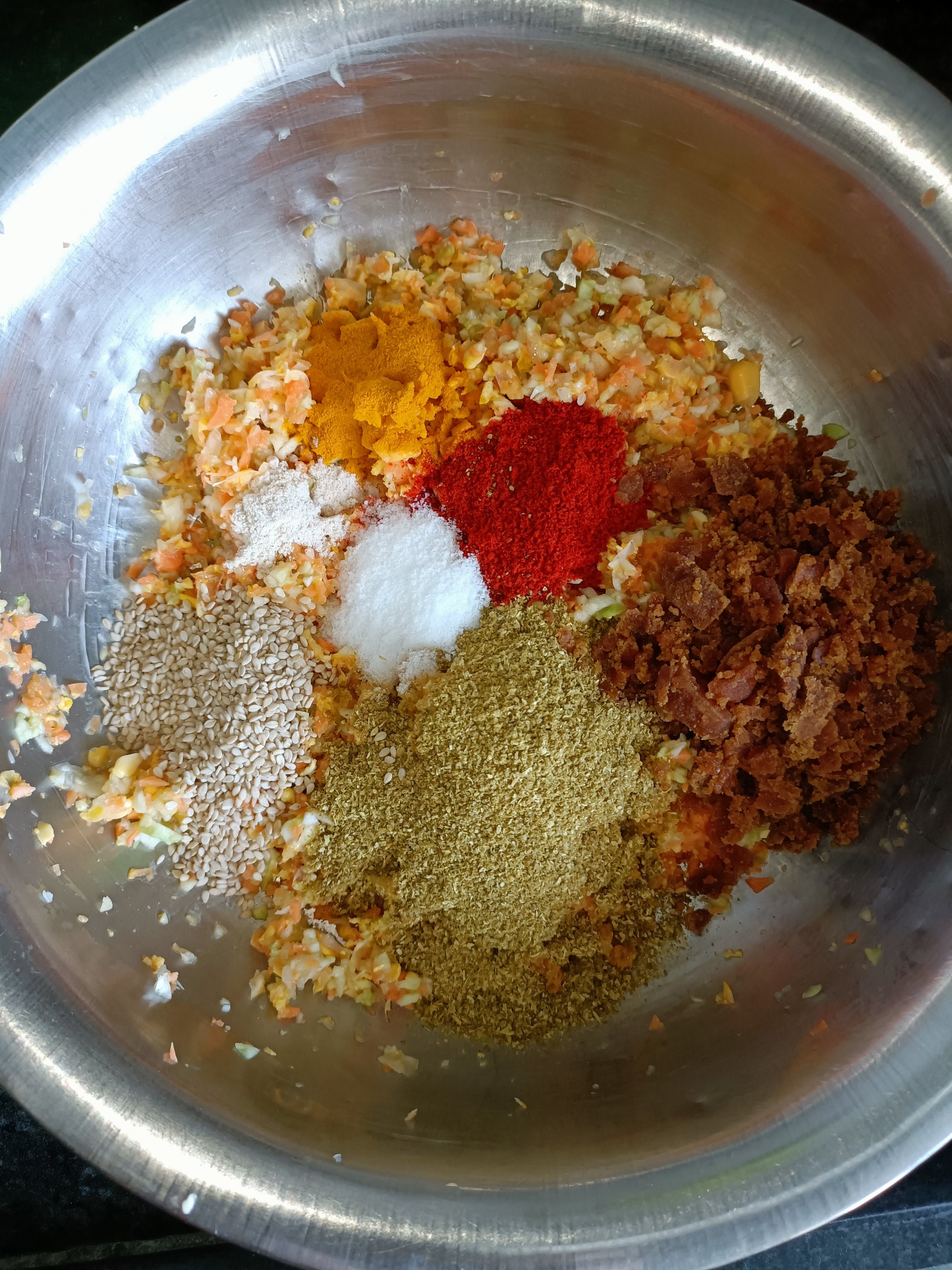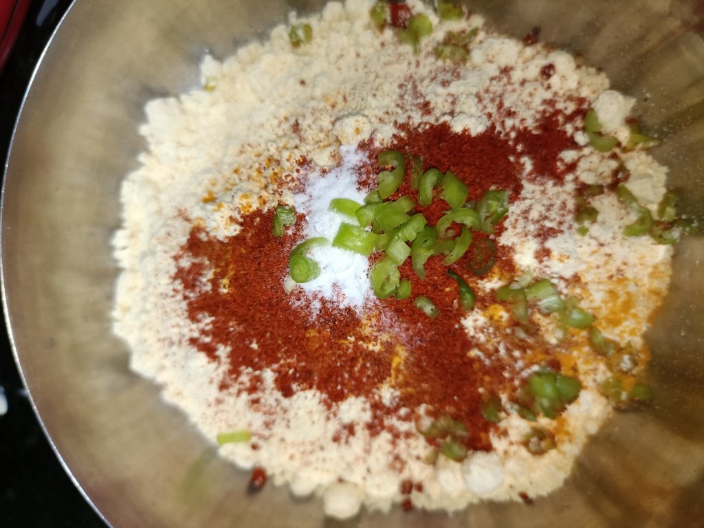 - In a mixing bowl mix both the flours, spices and soda and make a smooth batter with the help of water. Adjust the consistency by adding more water ( see video).
