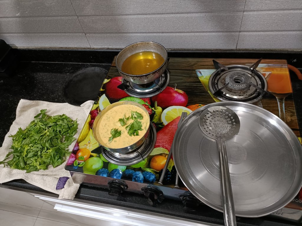 - Once oil heat check it by dropping 2- 3 drops of batter . If drops come immediately on the surface of the oil it means oil is ready for frying bhajia but if drops sit at the bottom it means still you have to heat the oil.