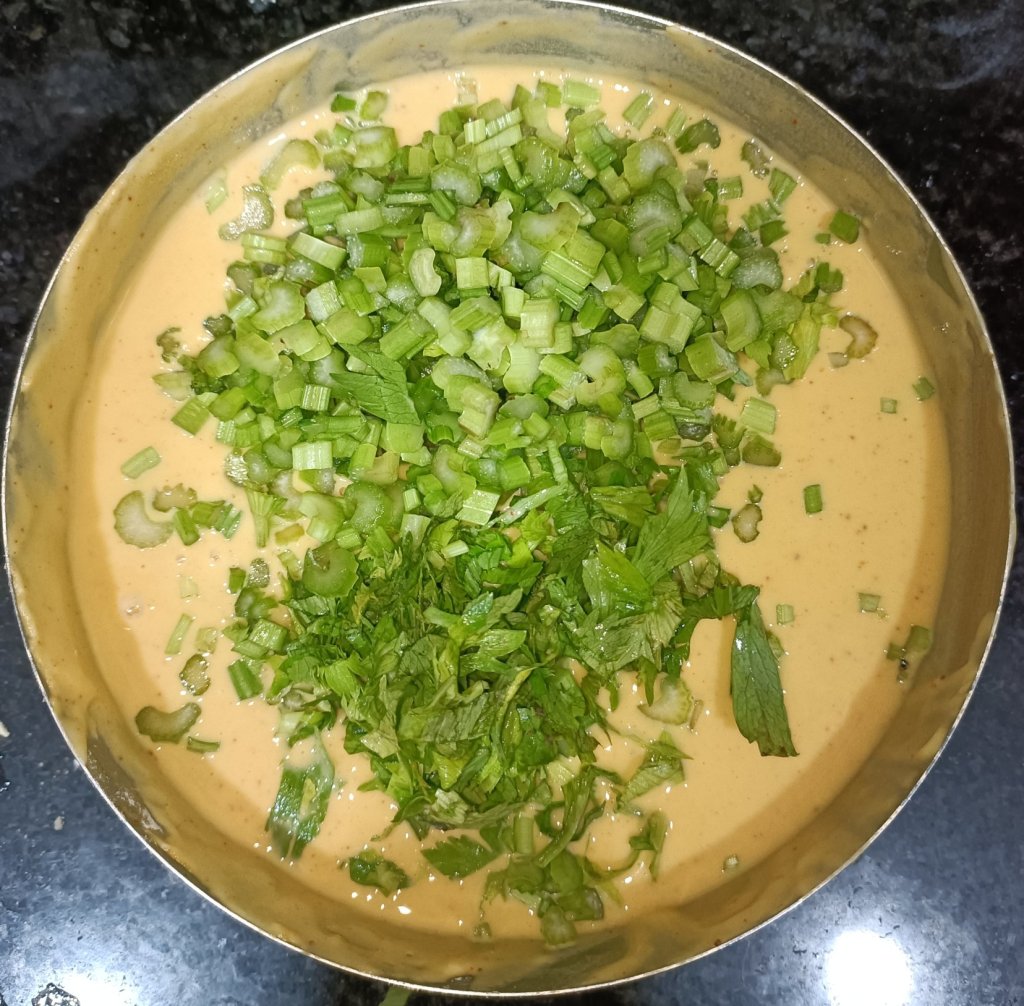 - Add finely chopped leaves and stalks . Mix thoroughly.