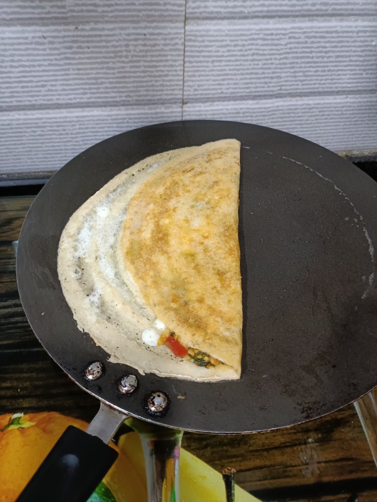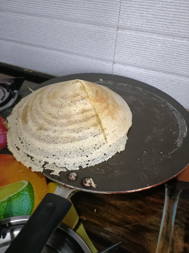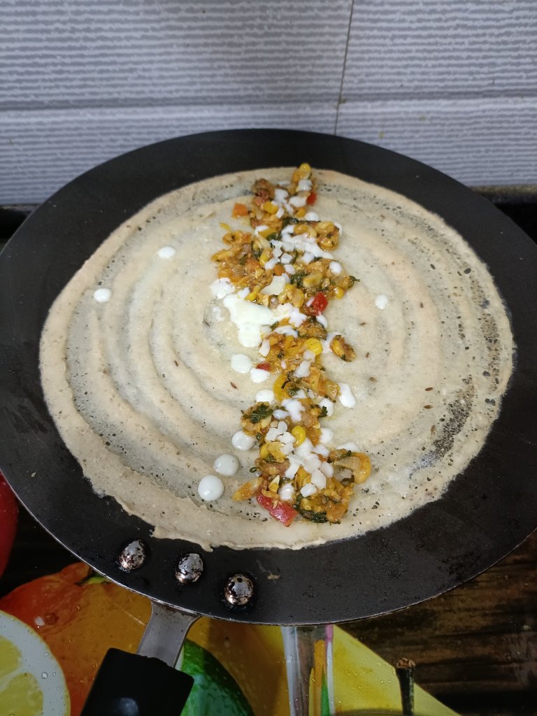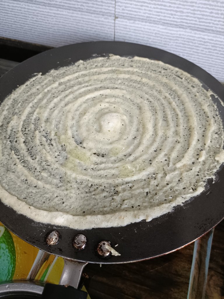 - Heat nonstick tawa and spread ⅓ cup of batter evenly in a circular manner.