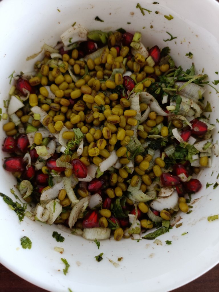 - In a mixing bowl mix boiled Moong with remaining ingredients and mix thoroughly.