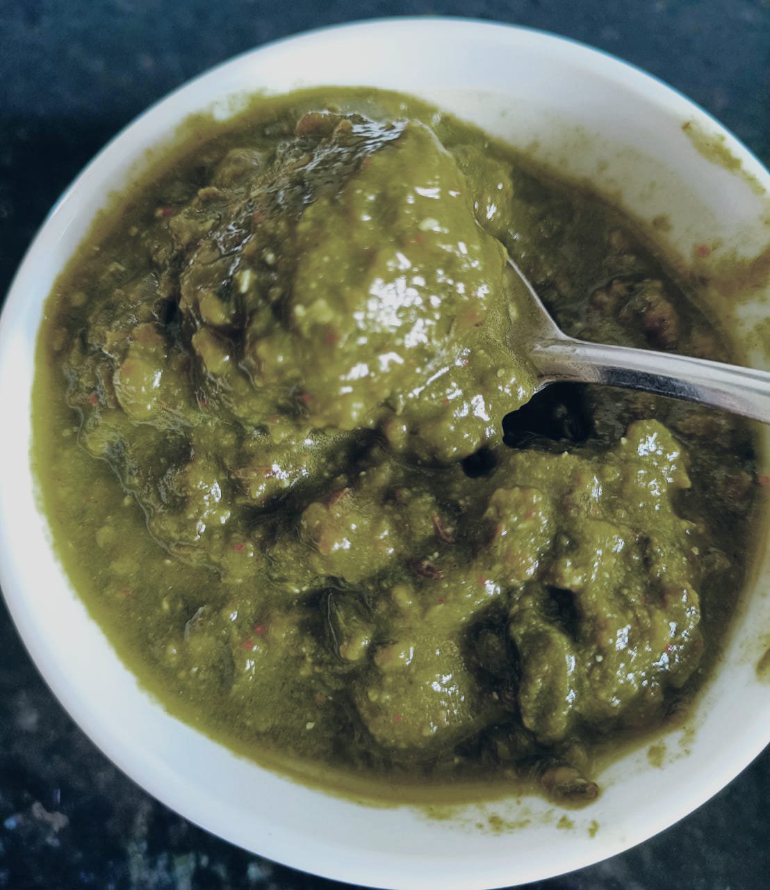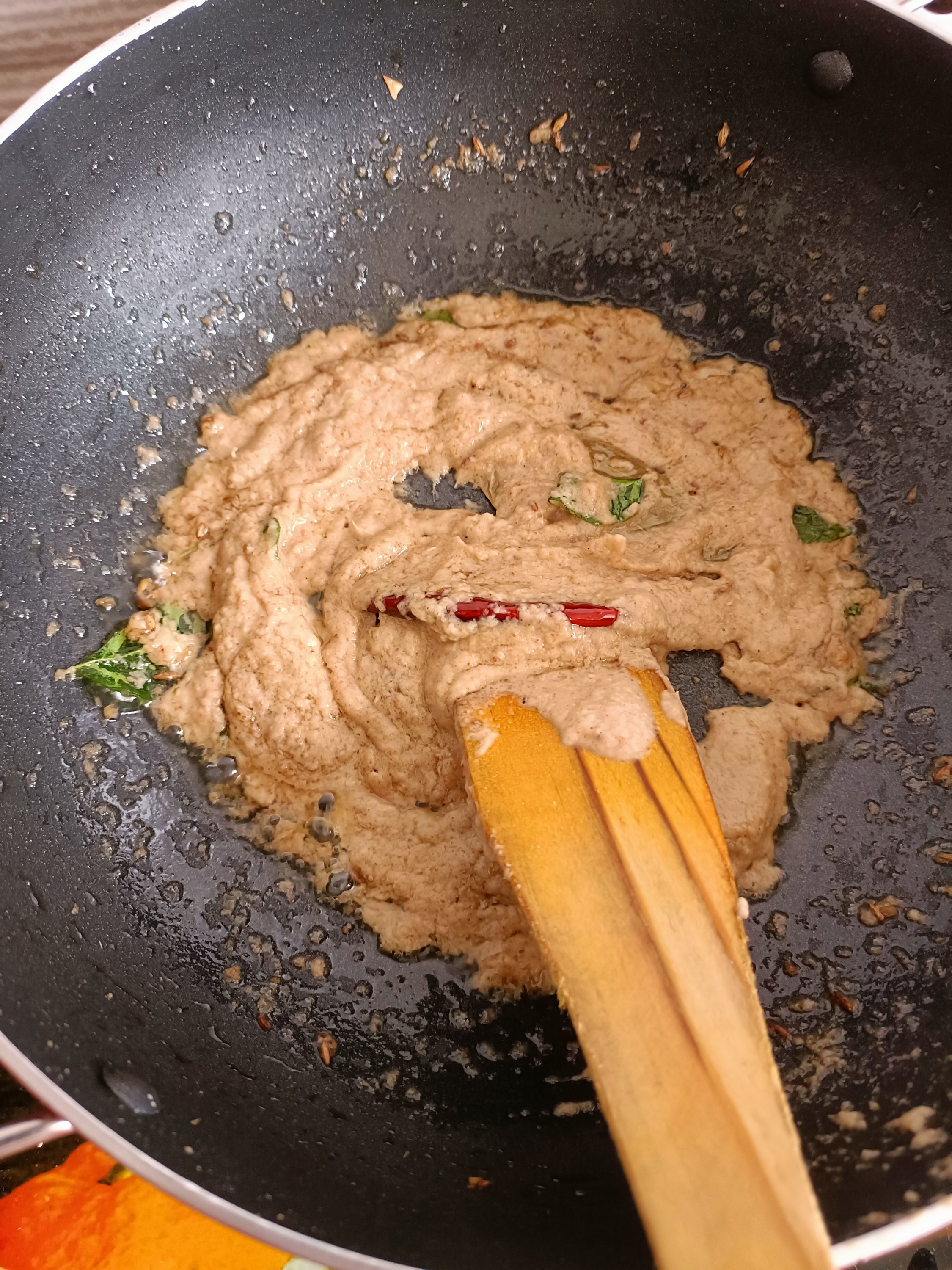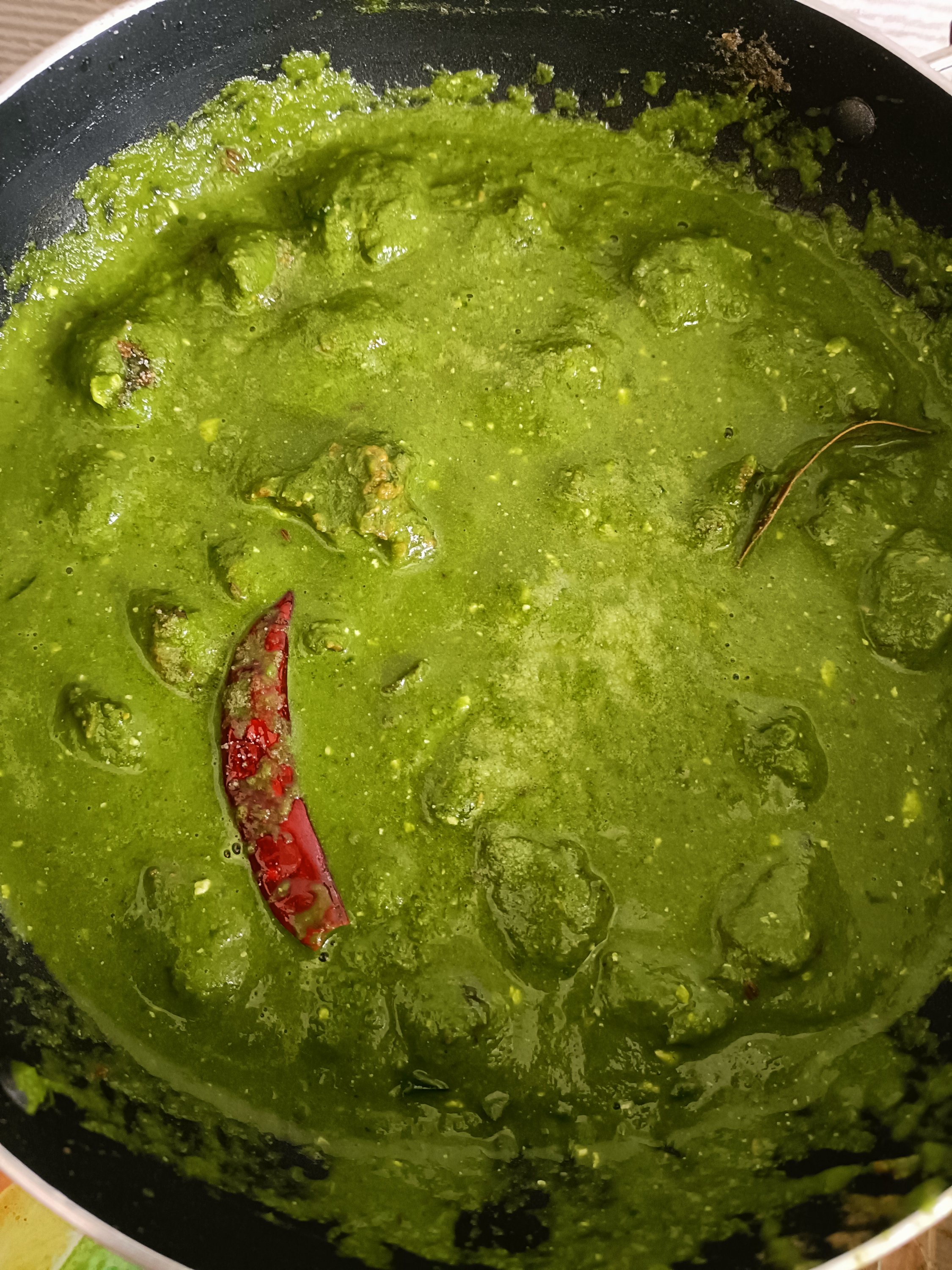 - Heat oil in nonstick pan and add Cumin seeds. After crackling sound add Asafoetida powder, bay leaves, curry leaves, red chilli. Quickly stir and add onion gravy . Soute till oil separates. Add curd and Spinach puree. Give quick stir for 2-3 times and then add 1 cup water.