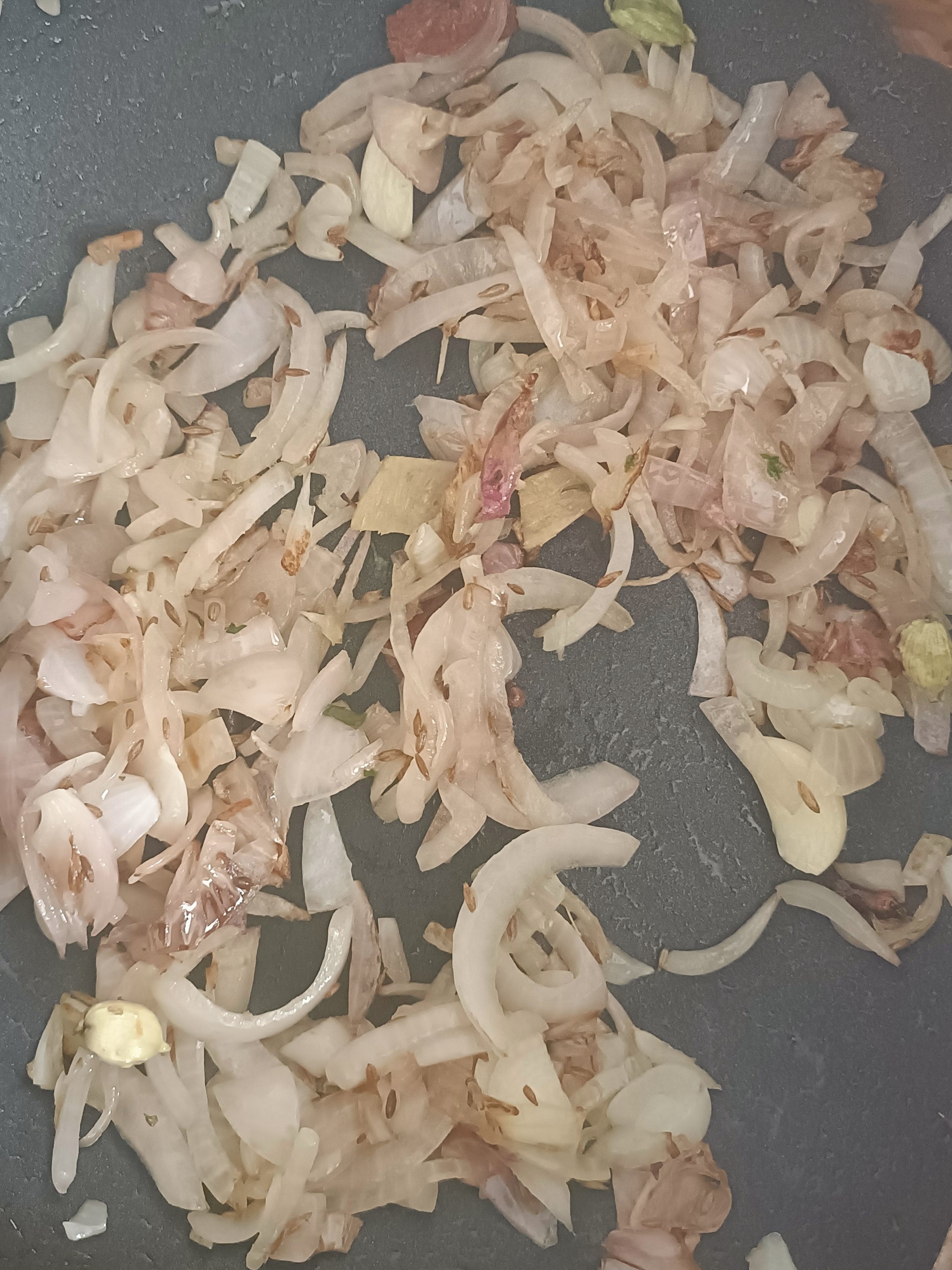 - Heat oil in nonstick pan and soute all dry ingredients and then add onion wedges, garlic pods and ginger .Soute till onion becomes translucent.
